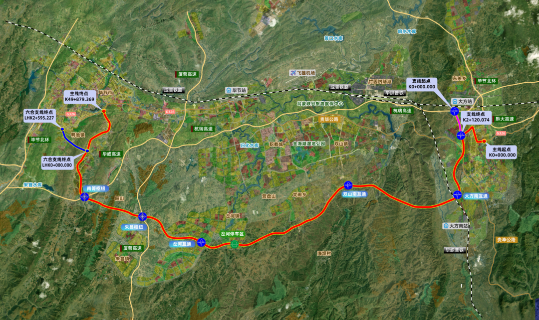 贵州交投集团所属交建集团投资建设的G326大方九驿至七星关鸭池公路项目主线起于大方县城九驿街道方沙路口,顺接既有G326凤山至九驿公路,经双山、文阁、岔河、朱昌、鸭池,止于七星关区鸭池镇同心立交桥,接既有G326七星关鸭池至长春堡公路。为打造高效交通“关键纽带”,项目配套建设7处互通(含3处枢纽互通)、8.65公里连接线,设置1处停车区、1处主线收费站及4处匝道收费站,同时同步规划建设两条支线——大寨支线衔接杭瑞高速公路(G56),六合支线顺接洪南路延伸段,形成“主线串联城乡、支线衔接枢纽”的立体交通架构雏形,与已建成的毕节东清高速(北环)形成互补,为构建中心城区绕城闭环奠定基础。
