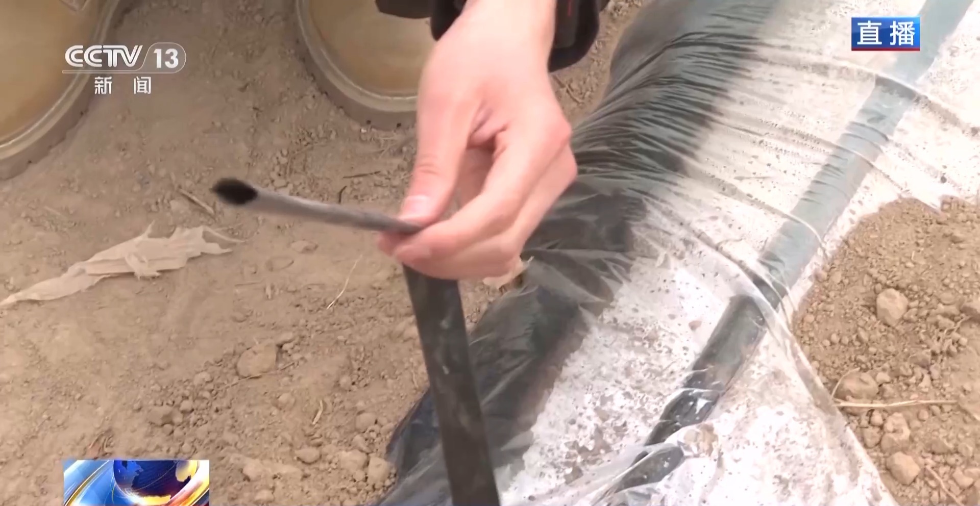 地上的覆盖膜就是铺设好的“水肥一体化管网”。在这一根黑色管道上面,每隔25厘米左右就会有一颗油菜籽大小的孔眼,通过滴灌的方式,它直接将水和肥料精准地输送到作物根系周围。这种技术不仅提高了水肥利用效率,还促进了土壤结构的改善。