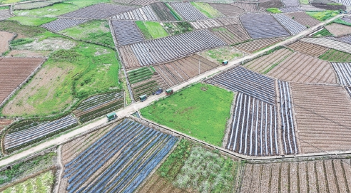 近日,湖南省永州市新田县龙泉街道兴泉村,油菜花田与线条柔美的覆膜田园相互映衬。刘贵雄 摄(来源:大国三农)