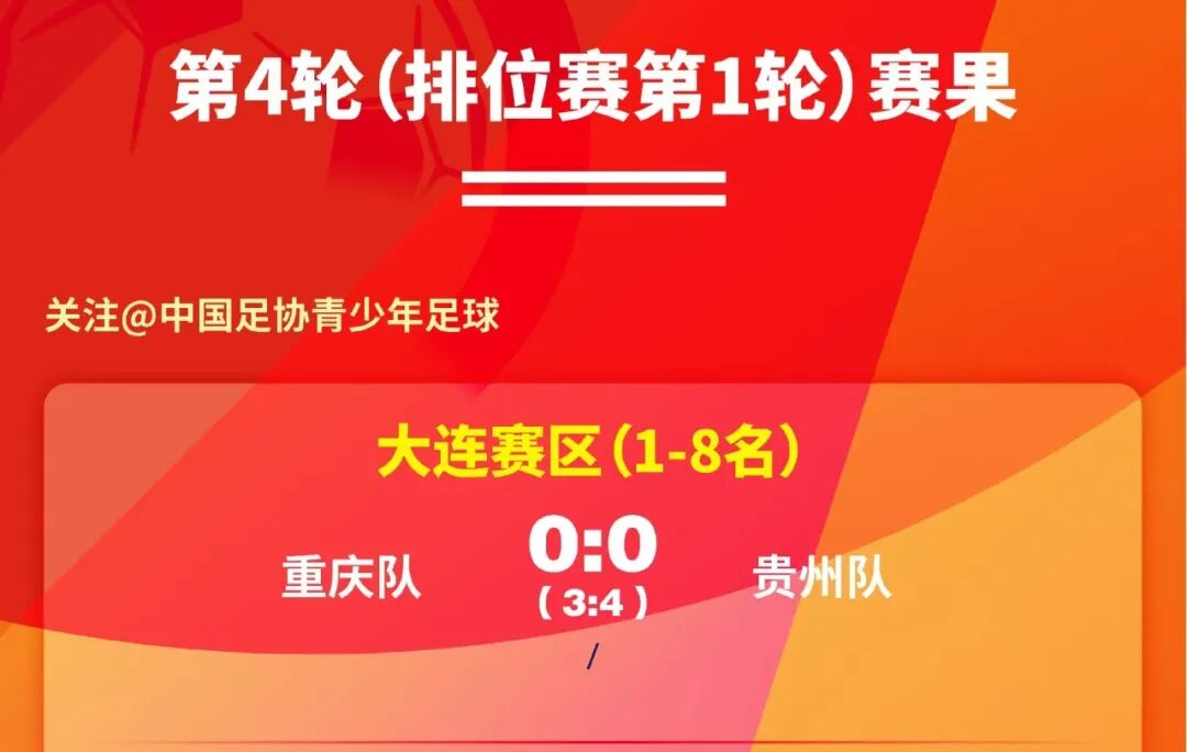点球大战中,贵州队小将们顶住巨大心理压力,稳扎稳打、每球必争,最终以4-3的比分击败重庆队,总比分4-3淘汰对手,成功晋级全国4强!