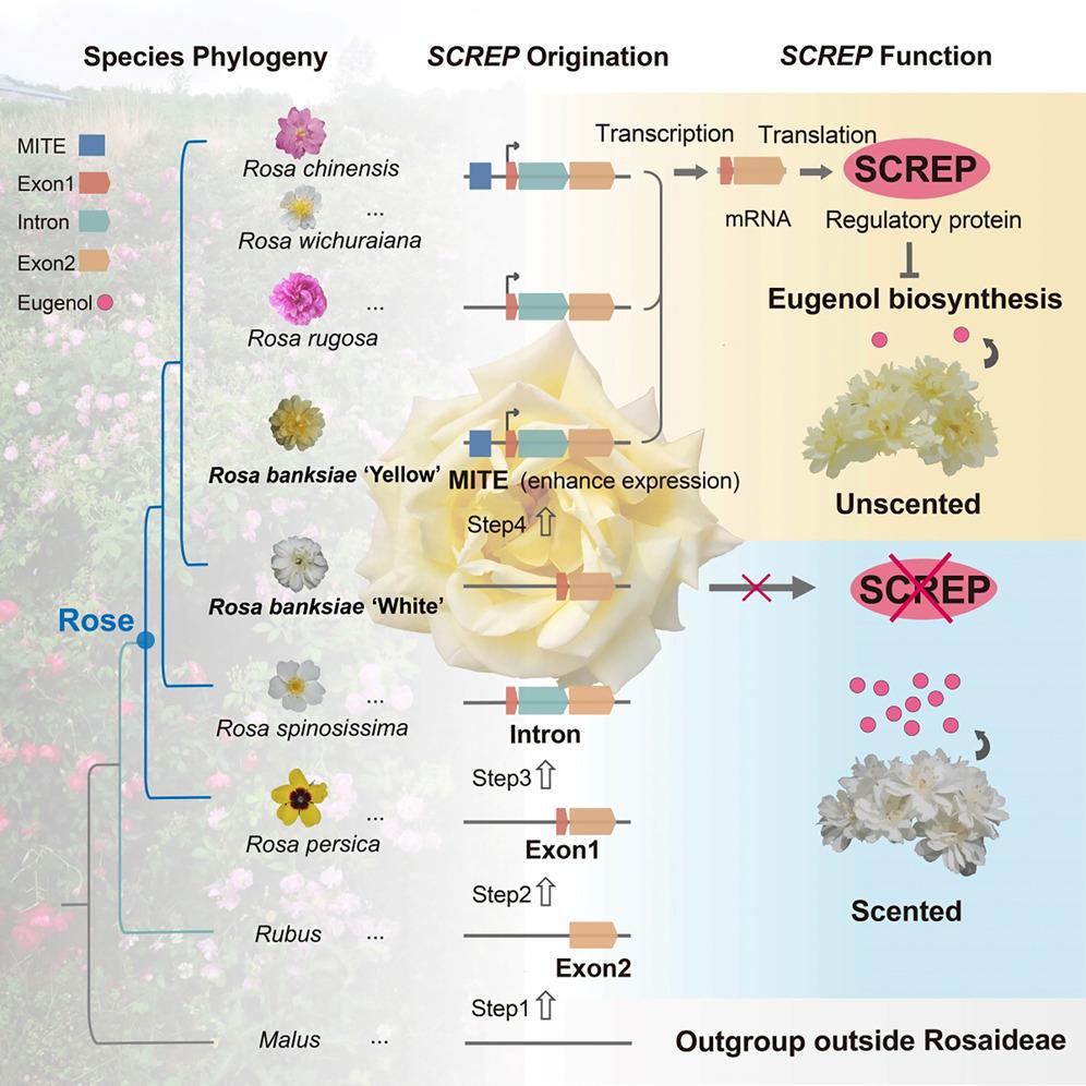 月季资源品类丰富,拥有数百个自然种和上万个栽培种,具有重要的园艺价值,适合作为生物多样性研究的模式植物。团队以月季为模式资源,研究发现了一个全新的基因,并命名为SCREP。研究证实该基因可以显著抑制月季花的关键芳香物质——丁香酚的合成。而这一新基因的诞生,是通过千百万年多步骤“拼装”而来。
