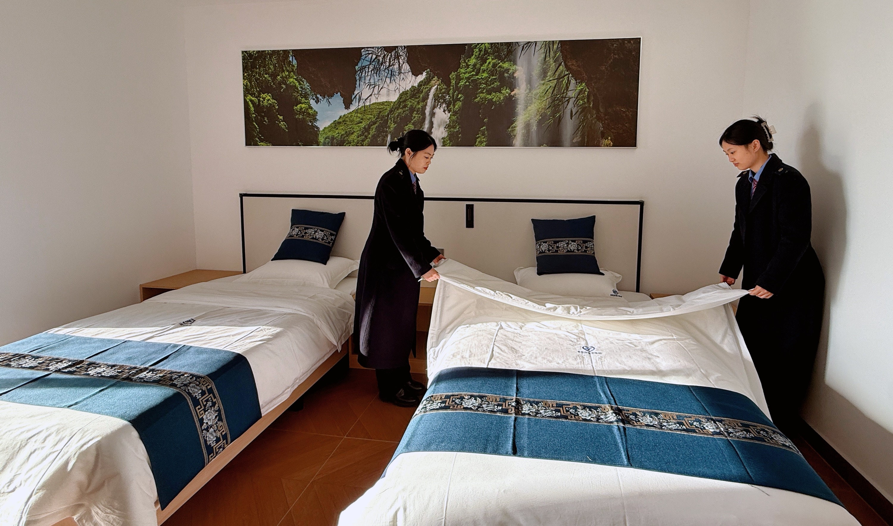 走进公寓客房,床单被罩刚被熨烫平整,带有布依族纹样的抱枕点缀其间,落地窗旁的茶桌已摆好茶具——这套融合了地域特色的布置,是公寓为入住司乘人员准备的“小惊喜”。“高铁跑得快,后勤得跟紧。”兴义南公寓负责人陈旭说,盘兴高铁开通后,他们优化了24小时值班制度,增设了洗衣房、休闲区,还根据车次时刻调整了餐饮供应节奏,“让大家出了驾驶室、下了列车,就能接住‘家的温度’”。