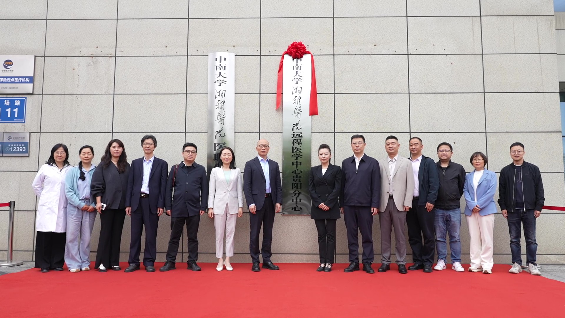 签约环节结束后,与会人员移步至医院门诊大厅。钱招昕副院长、郭莉莉局长、李永念书记共同为“中南大学湘雅医院远程医学中心贵阳分中心”揭牌。红色幕布缓缓拉开,象征着湘雅医院与贵阳市的医疗健康合作开启了“云端”互联的新篇章。最后,全体领导与嘉宾合影留念,记录下这一重要时刻。