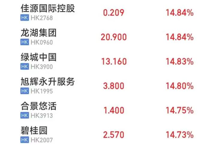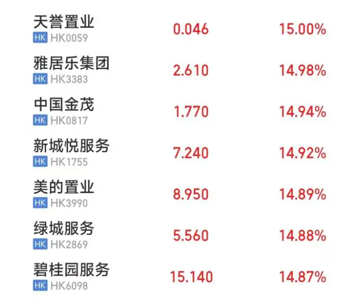 此外,港股内房股也强势高开,雅居乐集团、中国金茂、美的置业、绿城服务、碧桂园涨近15%。