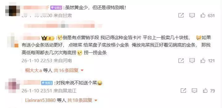 此事冲上热搜并引发了不少网友讨论,有网友表示:“不管黄金含量多少,顾客进去消费后还能让门店这么宠着,谁不爱呢。”“就餐时候的情绪价值也很重要。”也有网友则认为:“对我来说不如送个菜。”