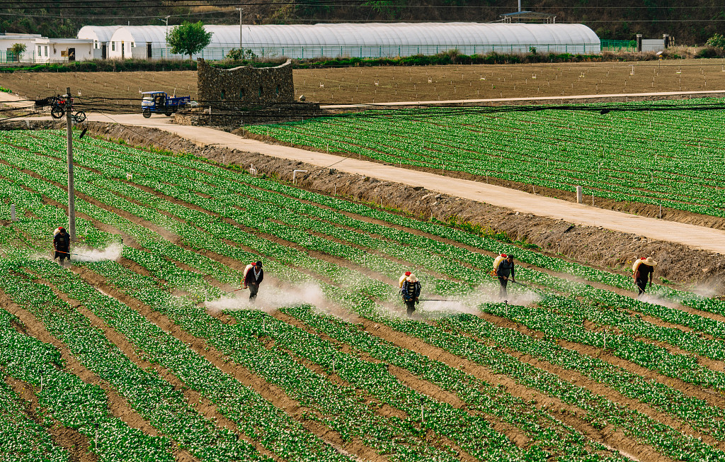 贵州黔西南,种植户在东西部协作供粤港澳大湾区蔬菜种植基地上开展喷洒作业 来源:视觉中国