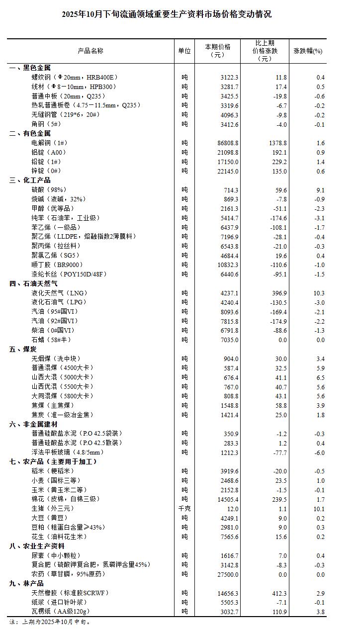 国家统计局:10月下旬流通领域重要生产资料26种产品价格上涨