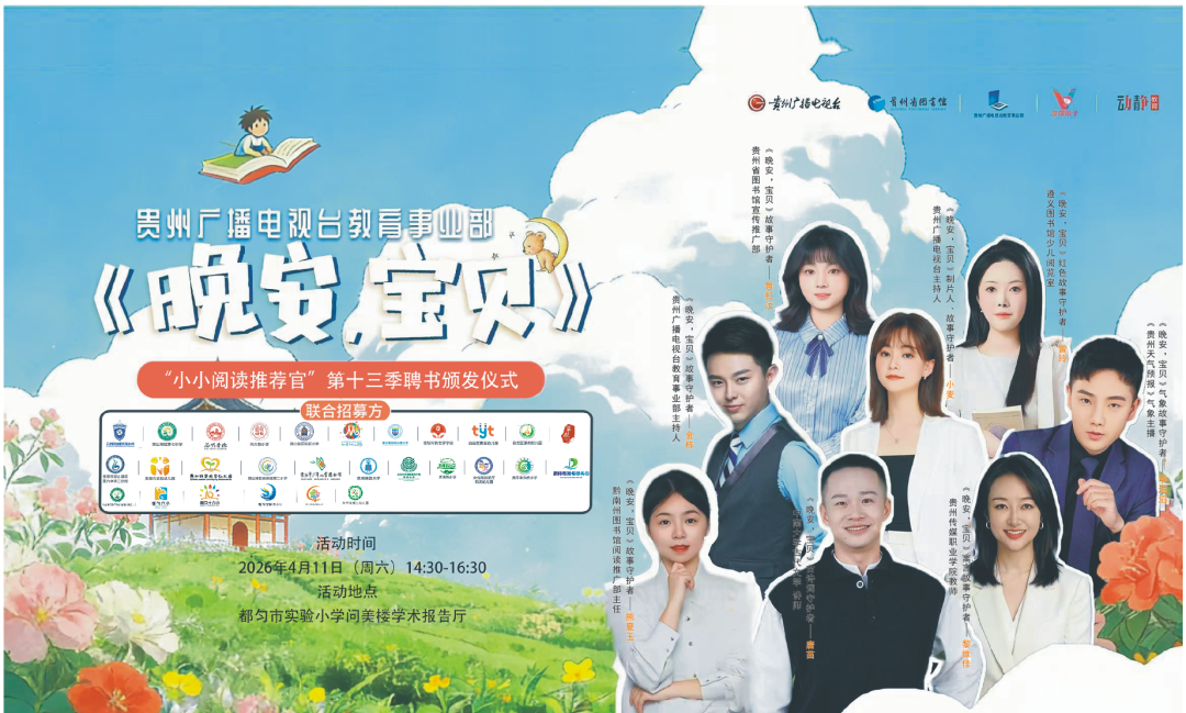 4月11日,在全民阅读蔚然成风的春日里,由贵州省图书馆、贵州广播电视台教育事业部联合主办,黔南州图书馆、都匀市图书馆、都匀市实验小学协办的《晚安,宝贝》世界读书日特辑暨“小小阅读推荐官”第十三季聘书颁发仪式在都匀市实验小学报告厅圆满举行。活动以“阅见黔南·童声回响”为核心,将阅读与民族文化深度相融,把红色基因、民族风情、经典阅读与少年舞台表达融为一体,让阅读不止于书本,更扎根于乡土、绽放于舞台。