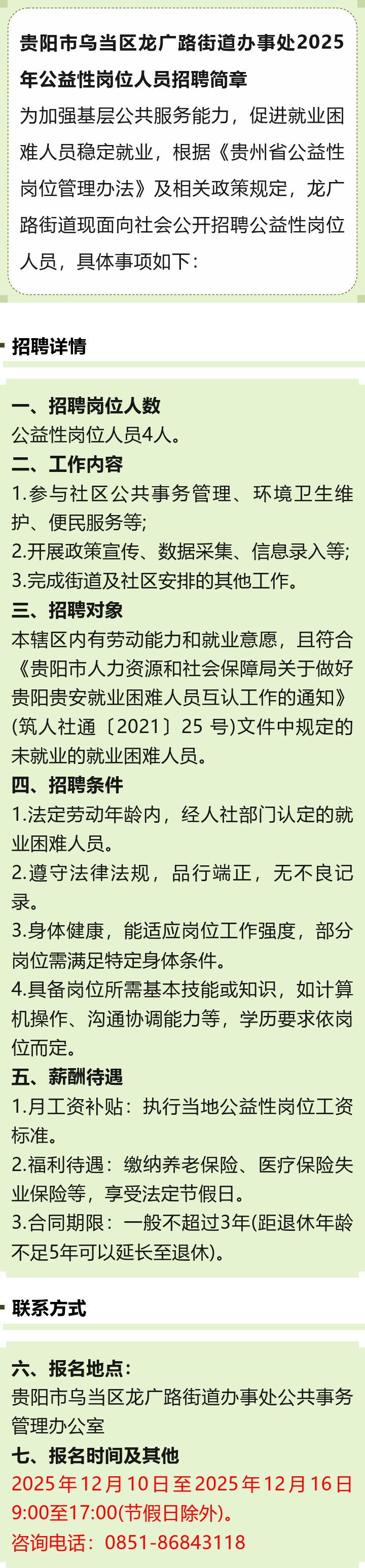 【政府机关】贵阳市乌当区龙广路街道办事处招聘!报名截止时间:2025年12月16日!