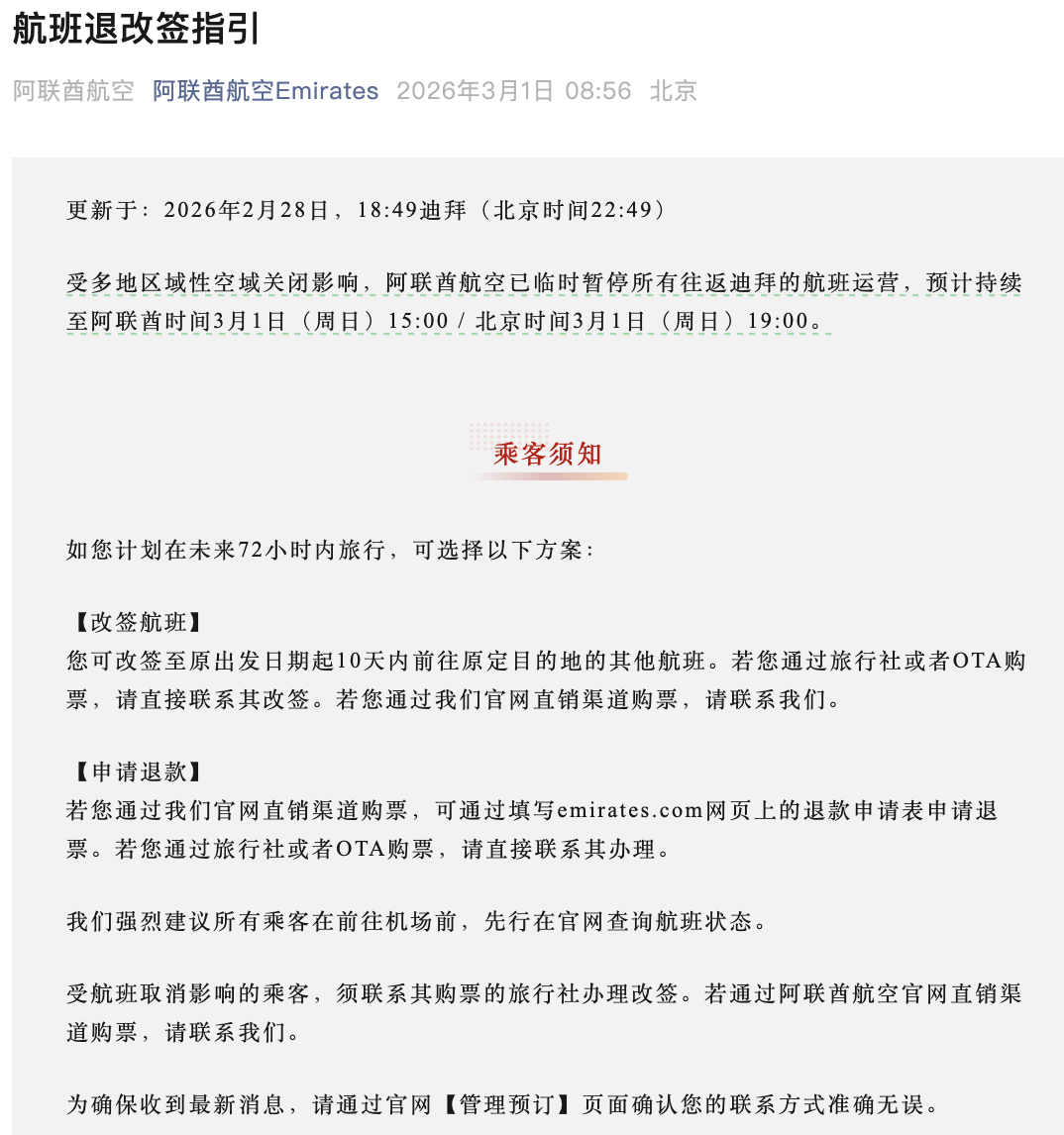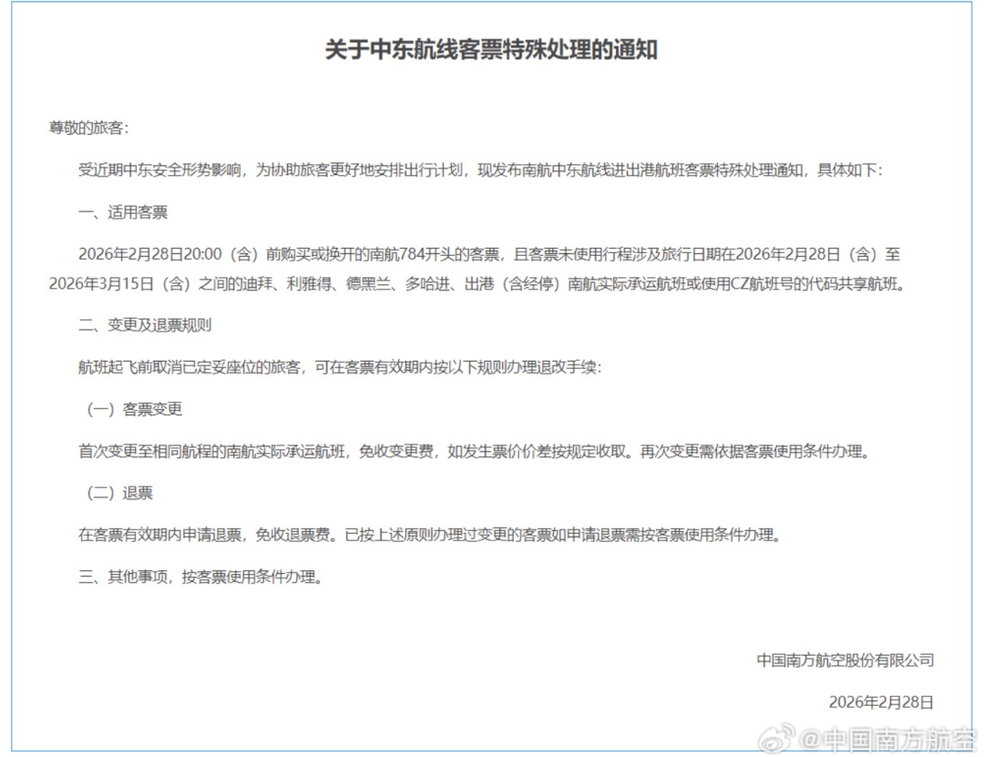 此外,中国南方航空、中国东方航空、海南航空、阿联酋航空等也已发布中东航线客票特殊处理方案。