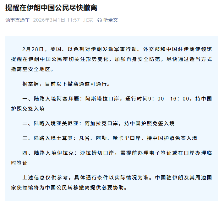 上述信息仅供参考,具体通行条件以实际情况为准。中国驻伊朗及其周边国家使领馆将为中国公民转移撤离提供必要协助。