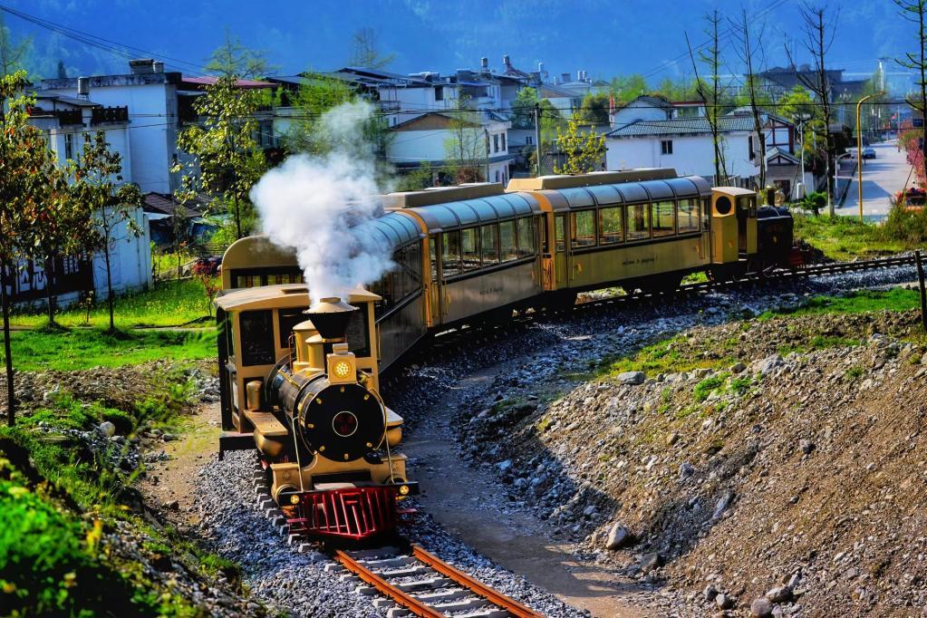 “呜……”沿着从矿井中拆下重新铺装利用的铁轨,一列旅游观光小火车穿行于清平镇格桑花海、七彩隧道与梦幻城等景点,通往曾经的矿工住宿区、如今的“矿工创业社区”。