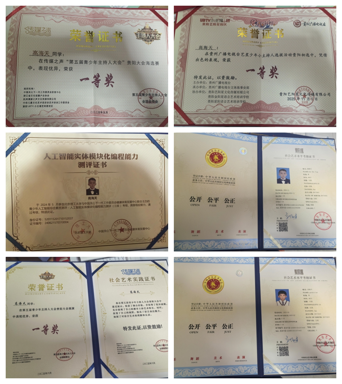 1.传媒之声“第五届青少年主持人大会”贵阳大会海选赛一等奖;