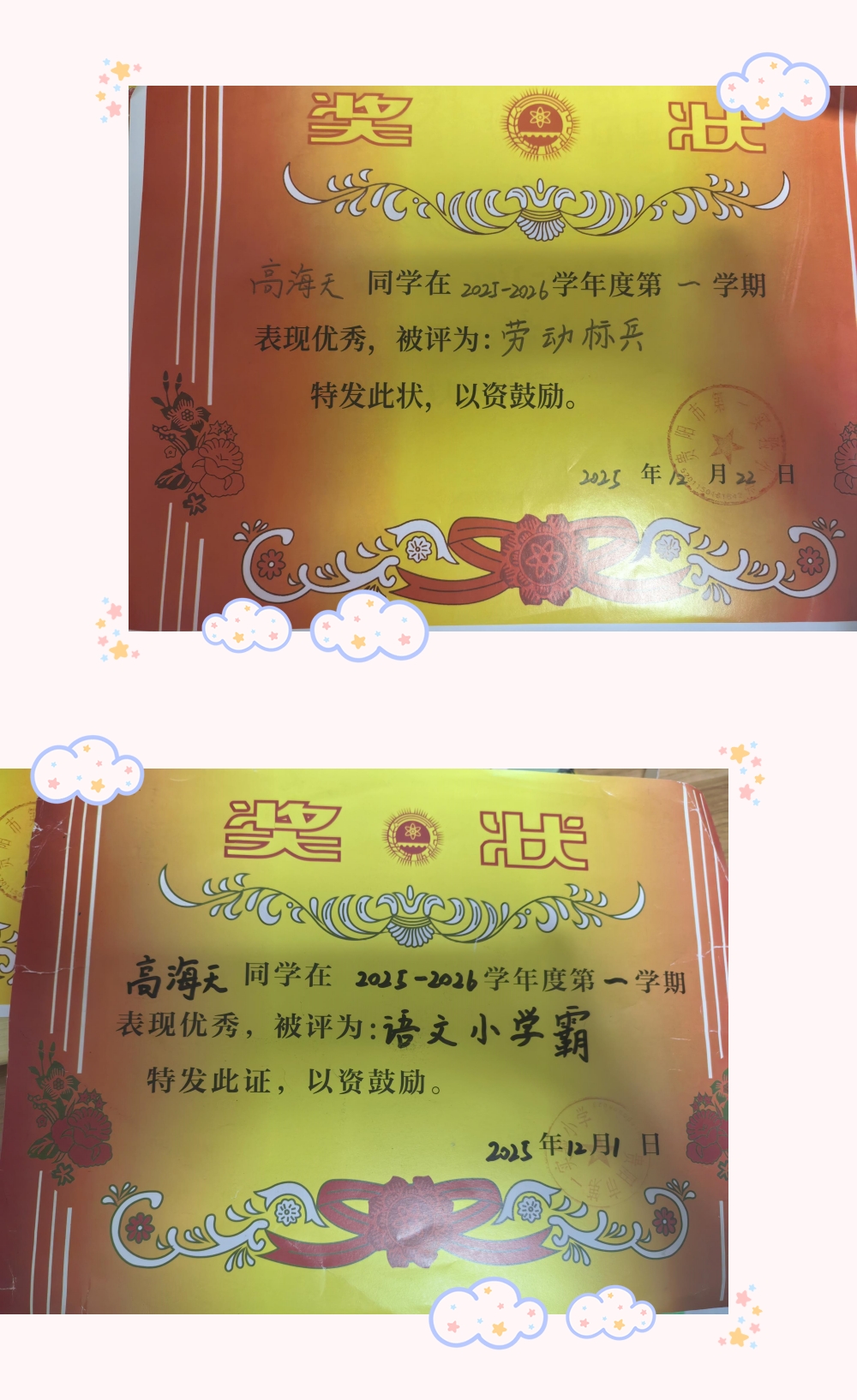 从四岁起,我就开始参加各种活动:三岁学舞蹈,四岁接触编程,五岁正式学习主持。在学校里,我也是个积极的小学生,从中班到一年级一直担任班级小干部,还获得过“三好学生”“语文小学霸”“朗诵小明星”“最佳球员”“老师得力小助手”等称号。这些经历让我积累了不少舞台和比赛经验,也让我越来越敢于表达自己。