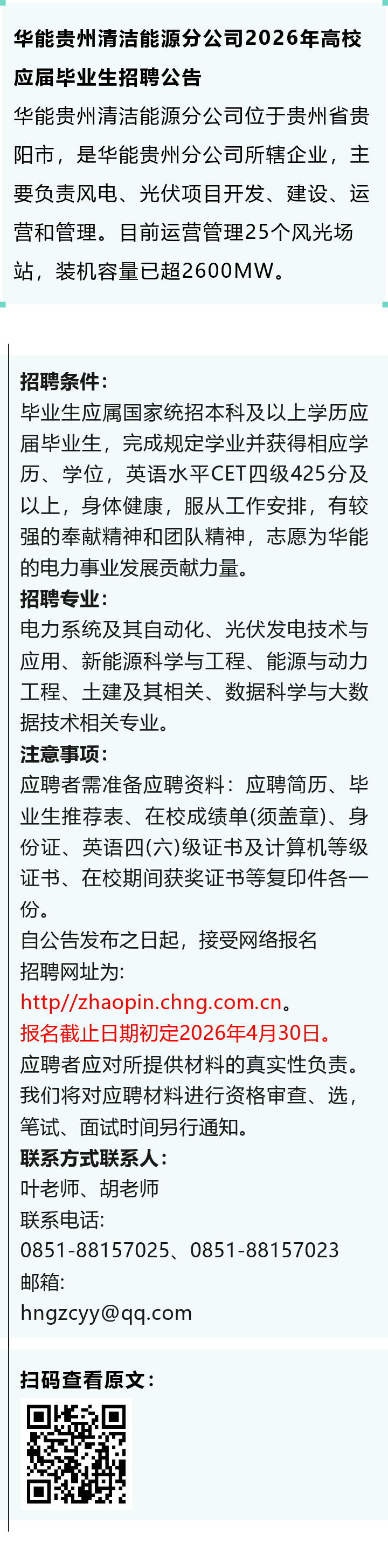【国企】华能贵州清洁能源分公司招聘!报名截止日期初定2026年4月30日!