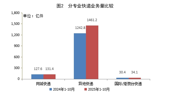 1—10月,同城快递业务量累计完成131.4亿件,同比增长3.0%;异地快递业务量累计完成1461.2亿件,同比增长17.6%;国际/港澳台快递业务量累计完成34.1亿件,同比增长12.2%。