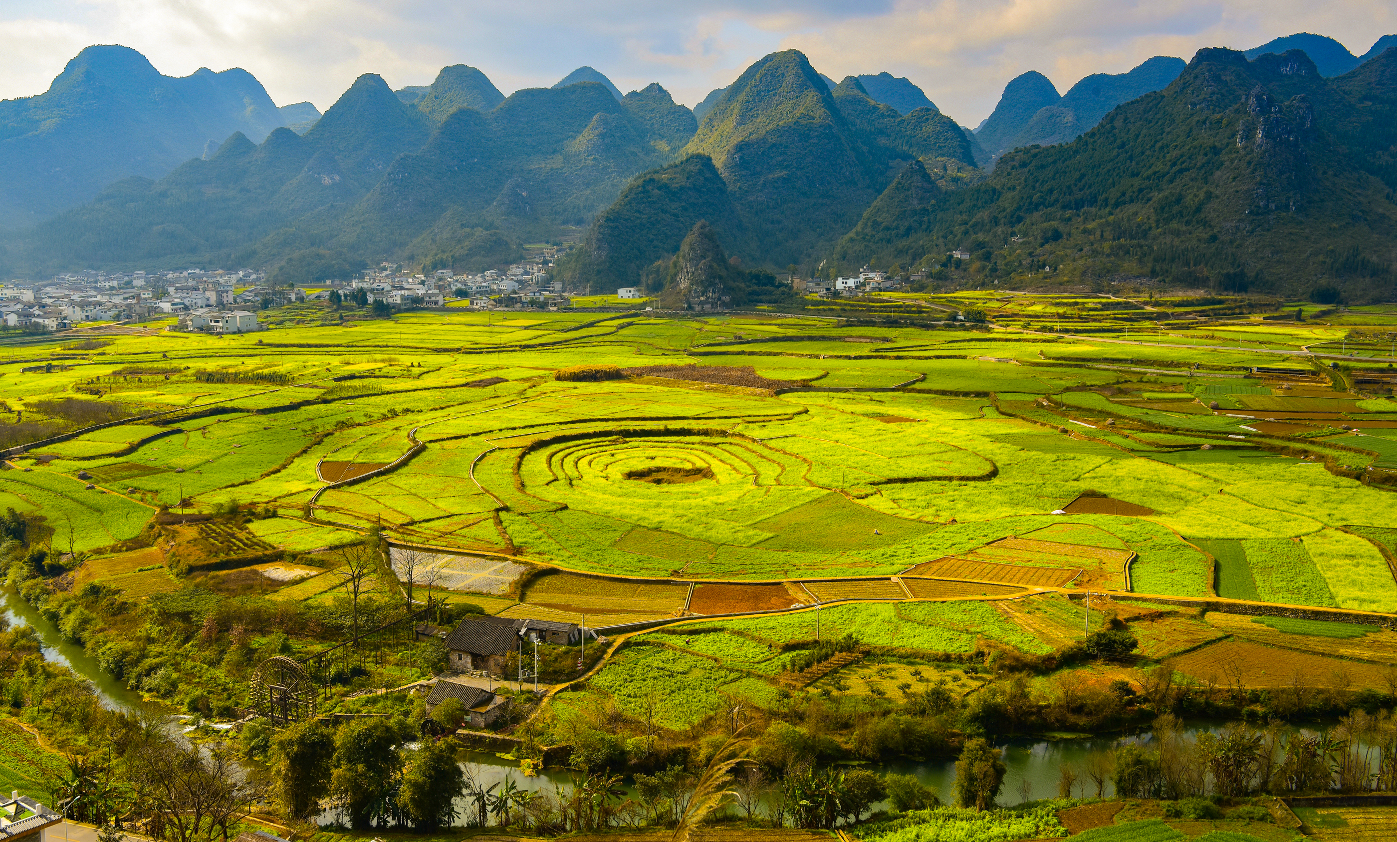穿梭于金黄的田野中,一座座圆润的峰林近在眼前,像极了和平谷里那些馒头状的山头。春季,油菜花为大地铺上金毯;秋季,稻浪翻滚,一片丰收景象。