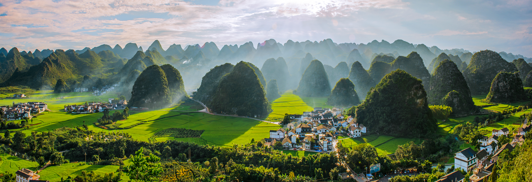 和平谷,《功夫熊猫》中“神龙大侠”阿宝的故乡,一个被群山环抱的谷地。晨雾如纱缠绕着青翠的山峰,宛如一幅流动的中国水墨画。而那份藏在山水里的灵动与静谧,总让人想起现实中黔西南兴义万峰林的模样。原来动画里的仙境,真的藏在现实的山水间。