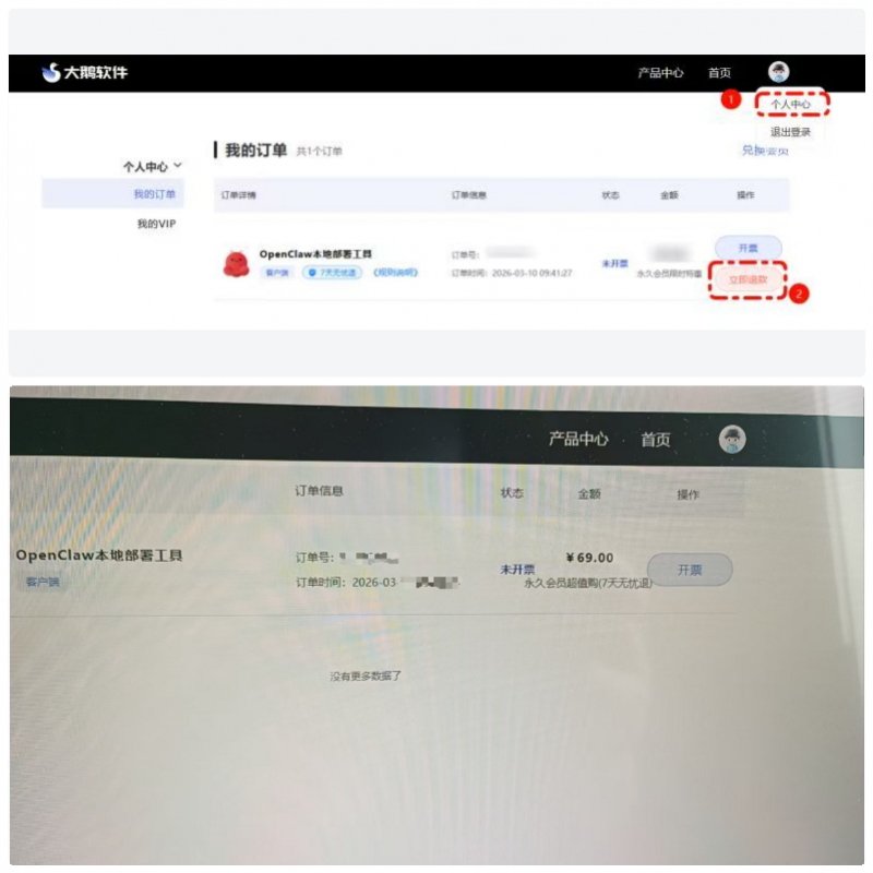 客服机器人提供的退款流程(上)与实际的订单界面(下)