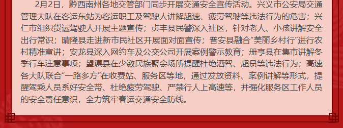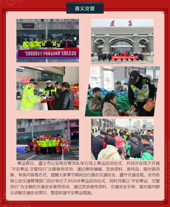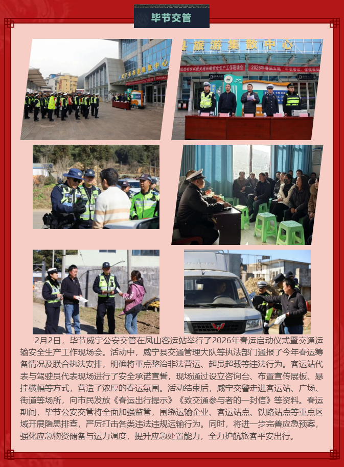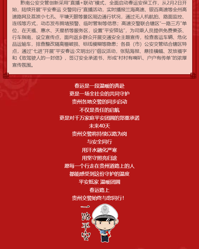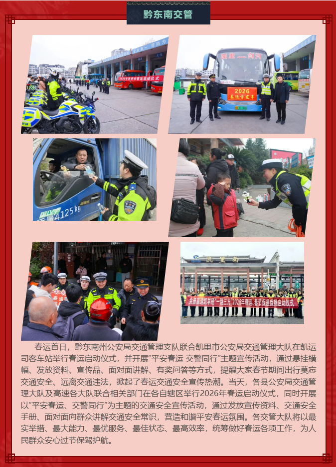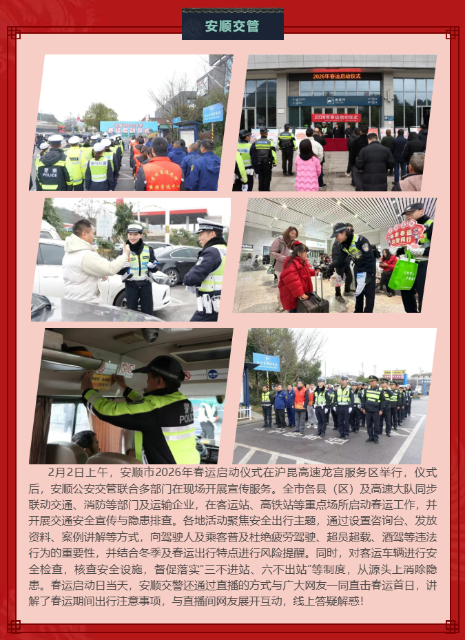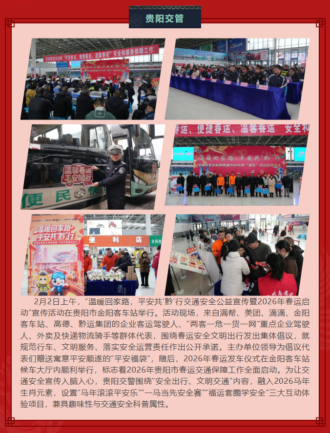 2026年春运于2月2日正式拉开帷幕!自2月2日起至3月14日,为期40天的春运“大考”中,贵州公安交管部门全警动员、尽锐出战。今日,全省各市州统一开启春运护航行动,一场围绕“平安、畅行、温暖”的守护之旅已全面展开。各地以最高标准、最实举措,筑牢春运安全防线,只为让每一段归途更安心,让每一次团圆更顺畅。
