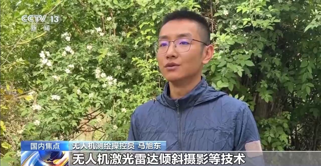 无人机测绘操控员 马旭东:简单来说,就是用无人机激光雷达倾斜摄影等技术,把真实世界1∶1数字化,构建高精度、可测量、可分析的三维模型,可以说是高效率、高精度、低成本。