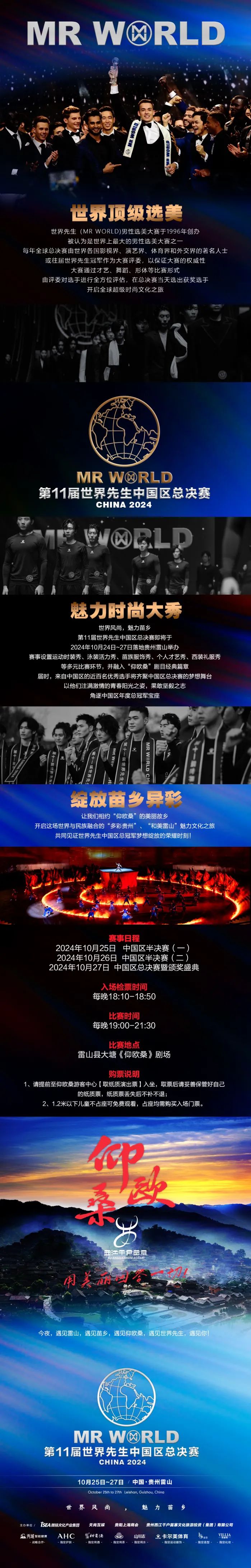 世界风尚,魅力苗乡。让我们在“多彩贵州”、“和美雷山”,共同见证世界先生中国区年度总冠军诞生的梦想时刻;在苗族文化中心的“仰欧桑”故乡,感受这场世界与民族融合的时尚盛宴!