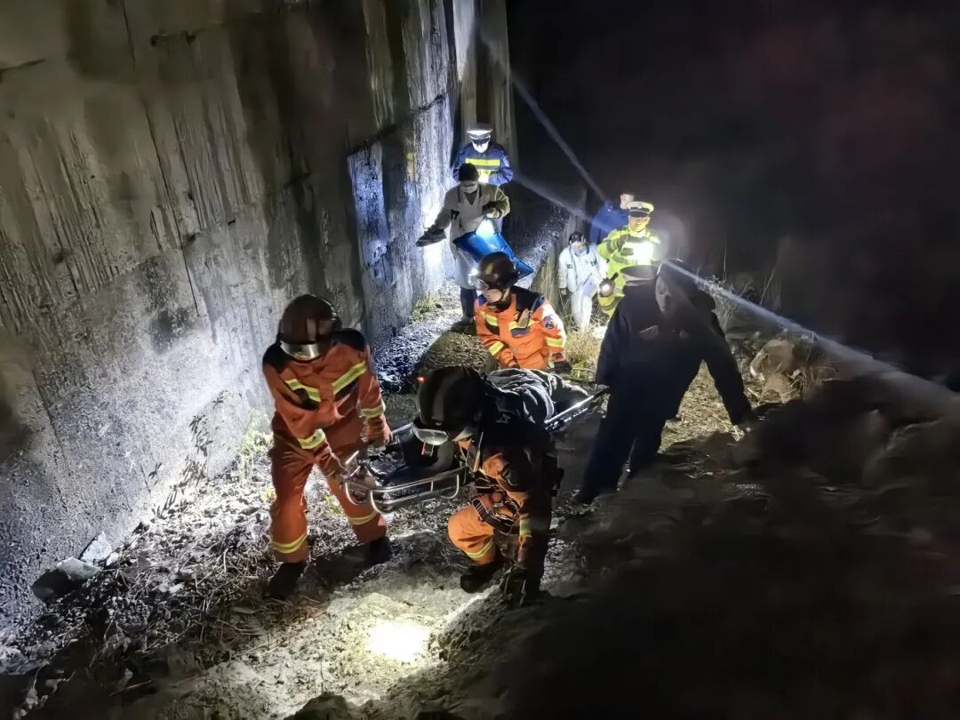 接警后,消防员迅速抵达现场,与当地民警协同开展救援。因事发凌晨视线受限,消防员做好安全警戒后,携带担架徒步绕行至桥下。经查看,该男子意识清醒,腰部、腿部、脚踝存在骨折情况,无法移动。在医护人员指导下,消防员将男子固定在担架上,合力将其平稳转移至桥面,随后送上救护车前往医院。