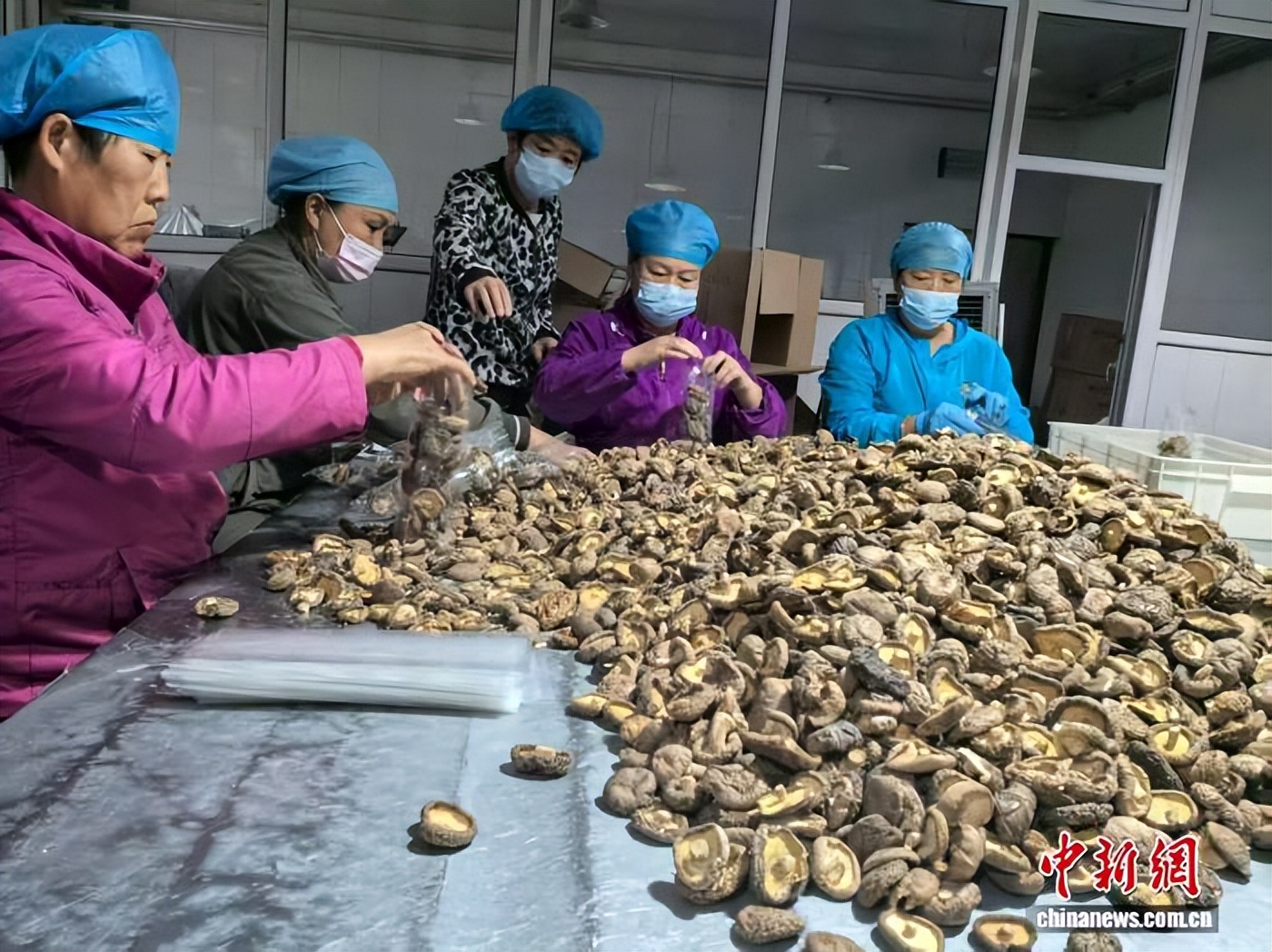 大兴安岭兴安鹿业有限公司生产车间内,工人将晾干的蘑菇装袋发往全国各地。 姜辉 摄