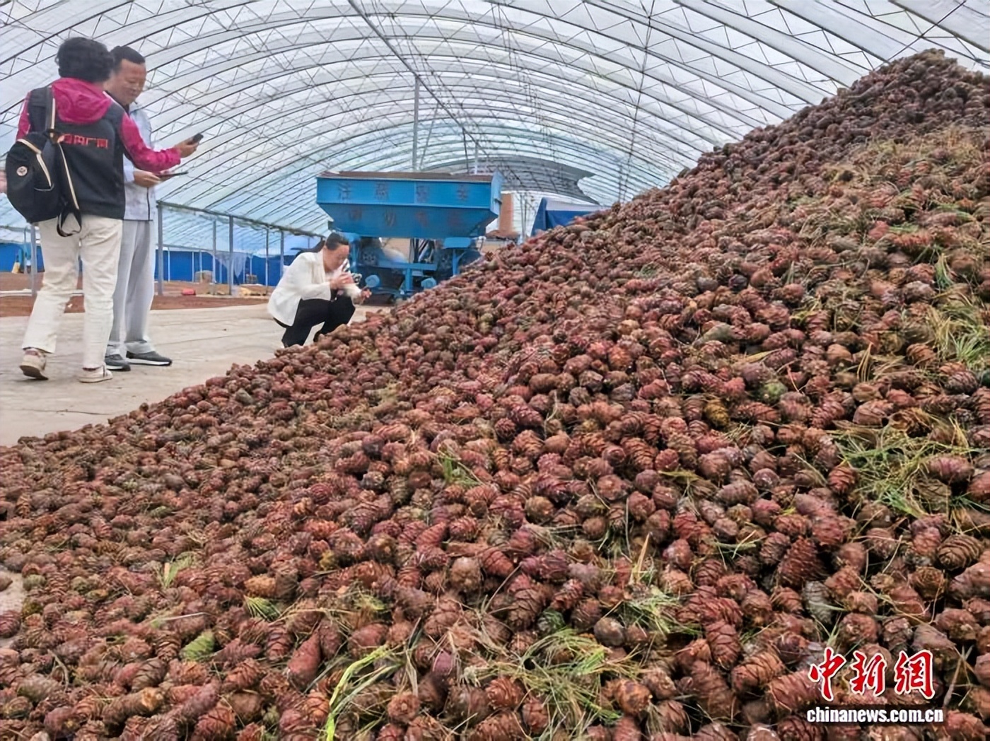 “这些都是刚脱粒的偃松子,需要晾晒烘干,然后破壳成偃松仁直接发往大连、青岛、梅河口等地。”位于大兴安岭新林区的大兴安岭印象北极食品有限公司院内,数十吨松子和松塔堆成小山占据了整个厂区。负责人老段一边指挥车辆运送松塔脱粒,一边蹲下来查看地上晾晒的偃松子的干燥程度。