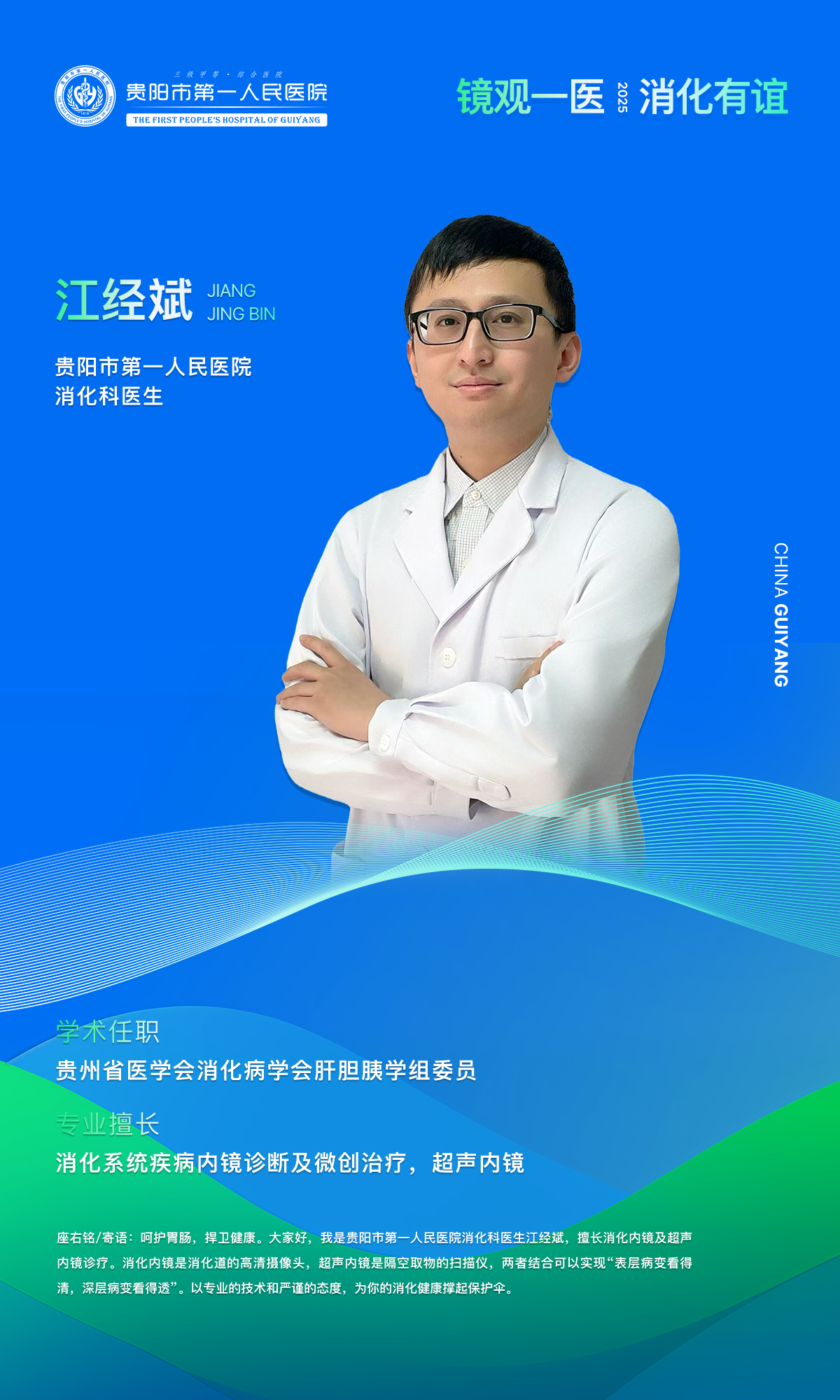 在消化内镜的方寸之间,有一束光,为我们照亮生命的细微之处;在守护健康的漫漫长路,有一群人,为我们披荆斩棘。他们,是医生,是护士,是并肩作战的“消化人”。“镜”观一医,消化有“谊” ,本期,让我们一同认识贵阳市第一人民医院消化科医生——江经斌。