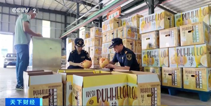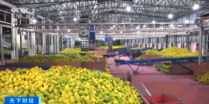 采摘下的金柚被送往当地现代农业产业园,分拣机器高效运转,分拣后的金柚根据不同规格,被统一发往各地销售。高峰期这里每天可以处理80万斤金柚。今年,当地农业产业园还引进了柚果全自动无损测糖分选生产线,以分级检测确定收购价,倒逼柚农提高种植质量。