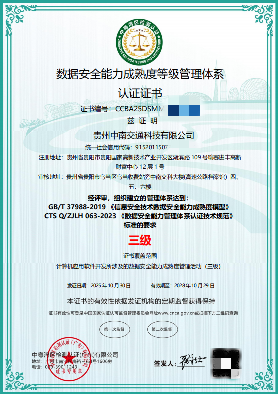 此次认证,标志着中南交科公司已从项目级的、被动响应的数据安全防护,全面迈入组织级的、主动规范的管理新阶段。中南交科公司将以此为契机,持续深化数据安全能力建设,为主营业务发展提供更强有力的支撑。