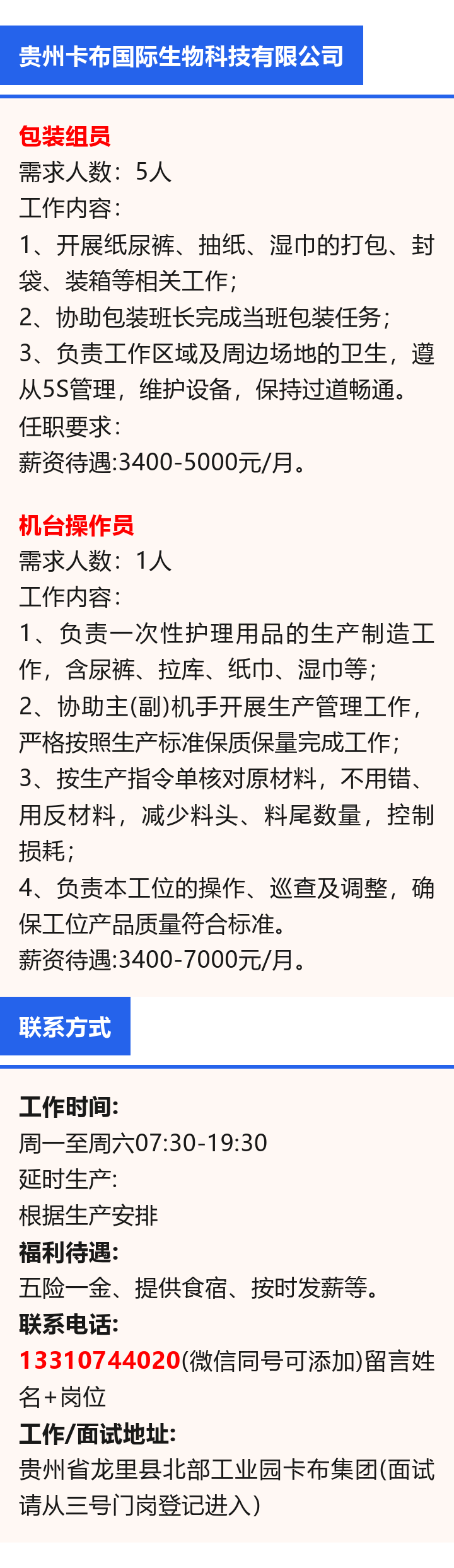 贵州卡布国际生物科技有限公司招聘!月薪可达7000元!五险一金!提供食宿!