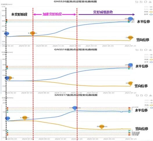 麻地隧道穿越格支村巨型堆积体D1,该堆积体规模宏大,长约1500米、宽200~690米、厚30~80米,其上分布着猴场乡格支村五、六、七组67户村民。隧道进口段约450米从堆积体下方基岩穿行,基岩顶板厚度仅12~26米,地质条件复杂且安全风险突出。为筑牢安全防线,施工前便对隧道两侧各100米范围内的堆积体启动地表及深部位移监测。2024年汛期以来,监测平台持续发出预警,截至当年11月25日,地表水平最大累计位移达140.8mm,竖向最大累计位移达-122.9mm,多个深部位移监测孔探测到深层滑动面,堆积体边坡进入蠕动变形阶段,监测预警升级为“警戒级(橙色)”。为保障村寨居民生命财产安全,精准掌握堆积体变形动态,安盘公司第一时间组织相关单位开展全面监测,多次邀请专家现场论证,持续深化数据研判,同步做好应急预案启动准备。2025年汛期,多地高速公路边坡险情频发,而麻地隧道堆积体凭借实时监测数据实现底数清晰、从容应对。截至目前,通过持续监测数据反馈,堆积体D1变形已趋于收敛。监测工作精准捕捉坡体变形趋势,不仅为风险处置决策提供了坚实科学支撑,更成功避免了对巨型深厚堆积体的盲目处置,实现了工程安全与居民保障的双重目标。
