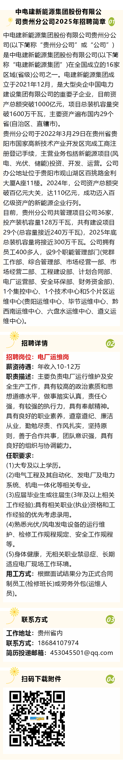 【国企】电建新能源集团贵州分公司招聘!年薪10-12万元!大专起报!
