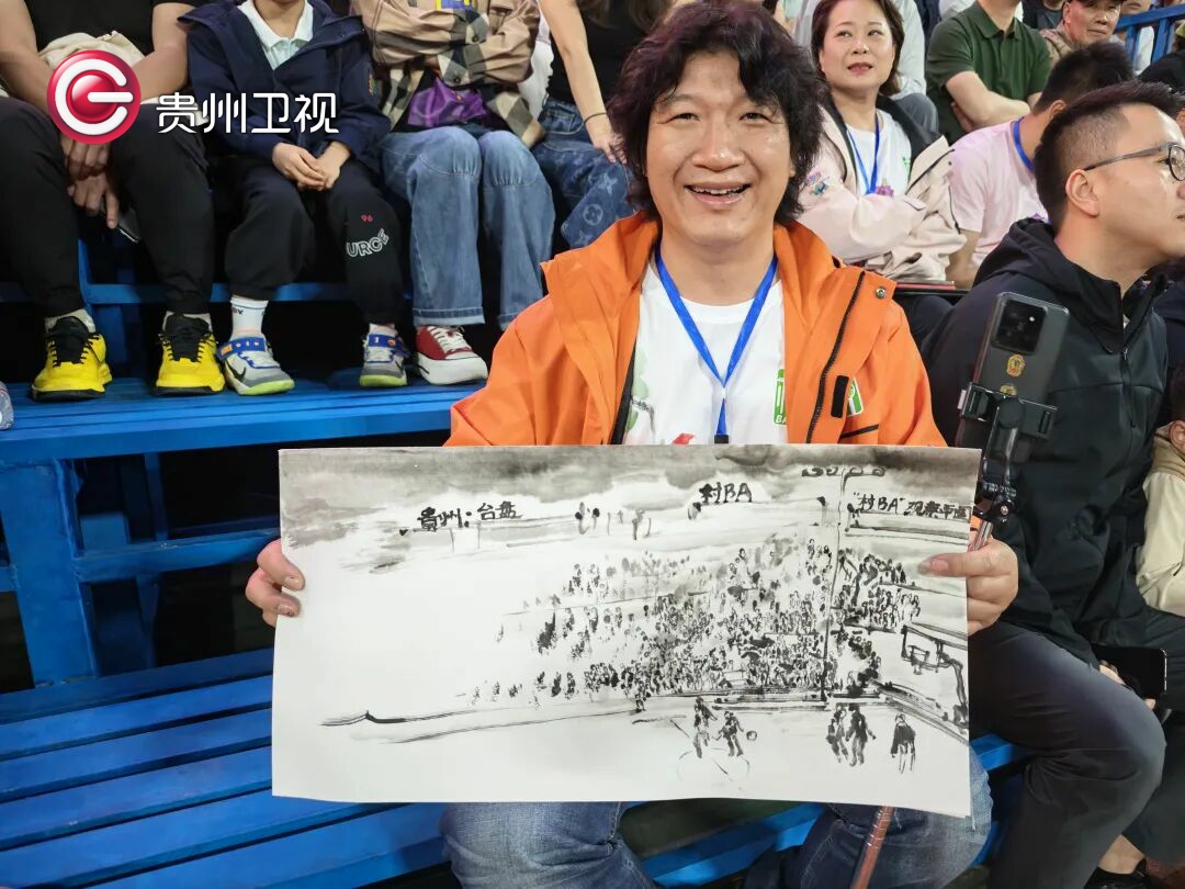 因为手机无法全景式记录现场盛况,袁祯宏发挥专业优势为贵州村BA总决赛画了一幅水墨画。“手机装不下那么多人呀,用画的形式来表现,也是我参与比赛传播的一种方式和情感表达。”他说,自己是篮球狂热爱好者,贵州体育的激情和力量让内心激动不已,“将来,我会带学生来这里,让他们感受体育最纯粹的模样。”