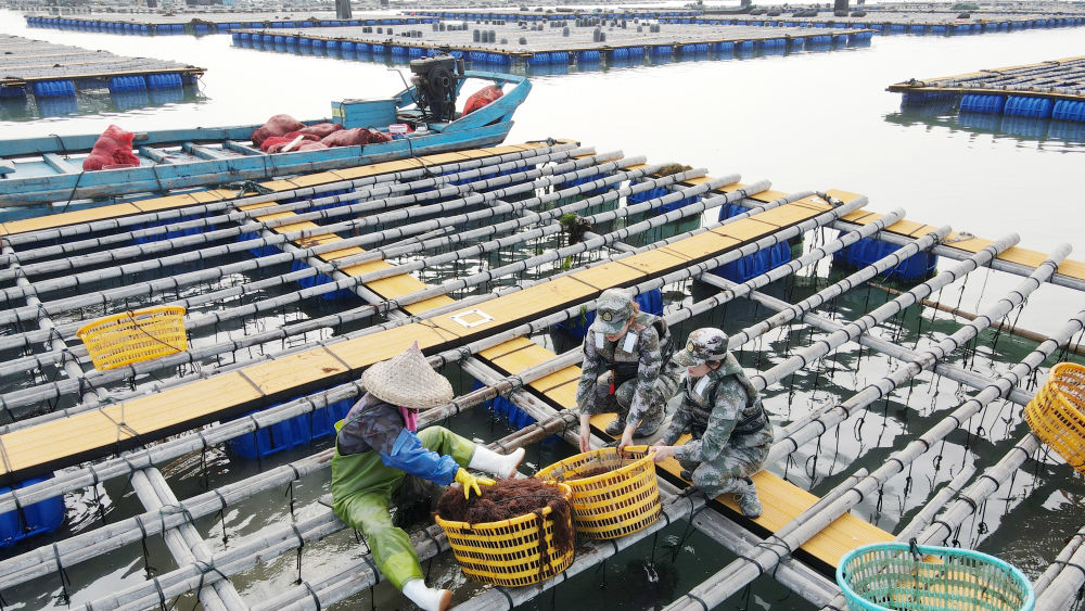 福建东山铜陵女子民兵哨所哨兵在铜陵蒲姜屿养殖区向渔民进行边海防教育宣传(2023年4月18日摄)。李涛 摄