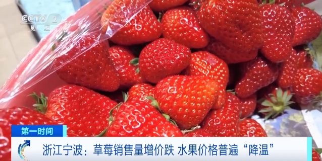 浙江宁波某超市店长 洪浩珍:草莓价格从每斤39.9元降到每斤29.9元,再降到每斤25.9元,今年销量和去年同期相比增长200%。