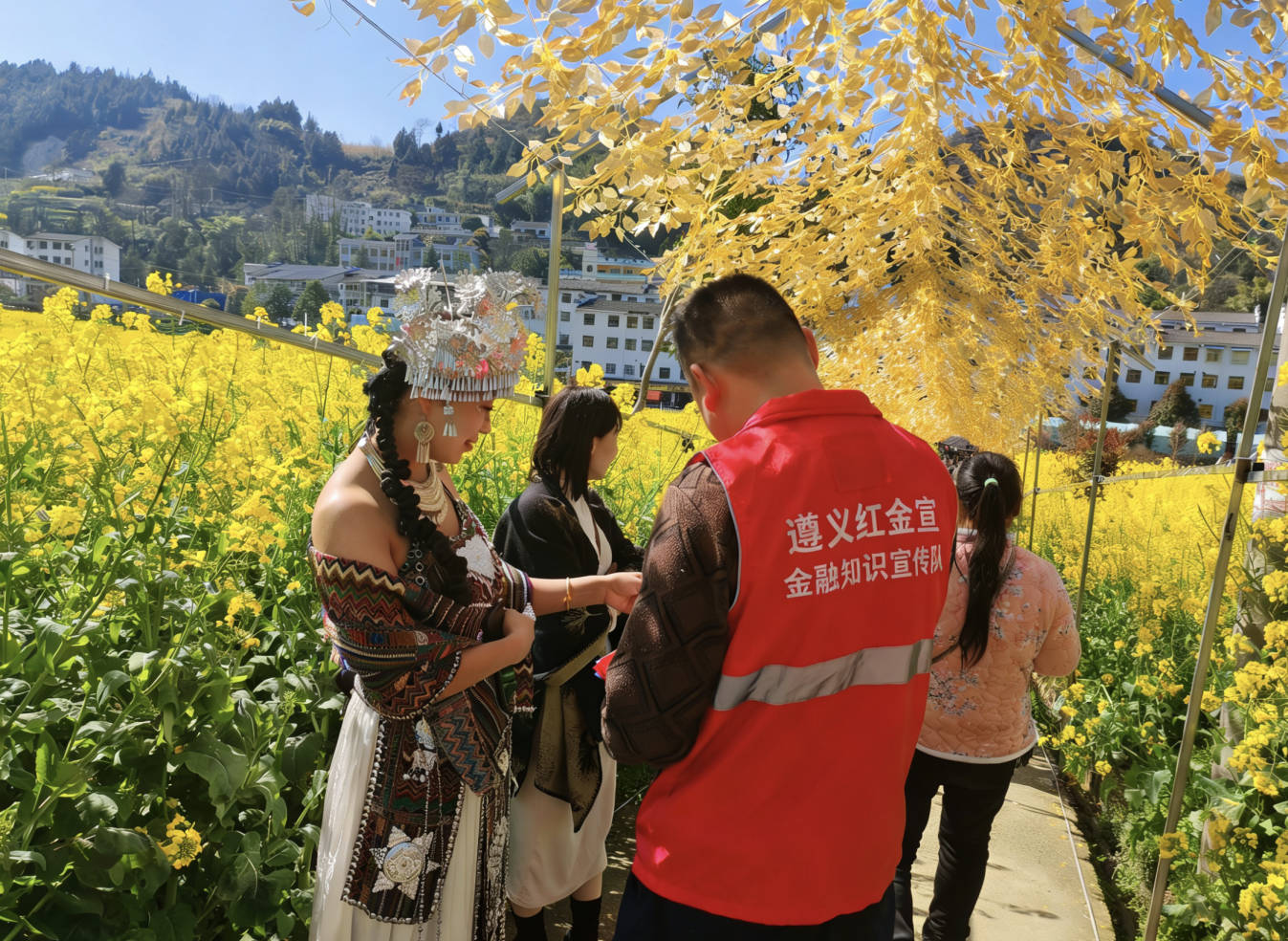 (“遵义红金宣”金融知识宣传队在油菜花田间普及金融知识)