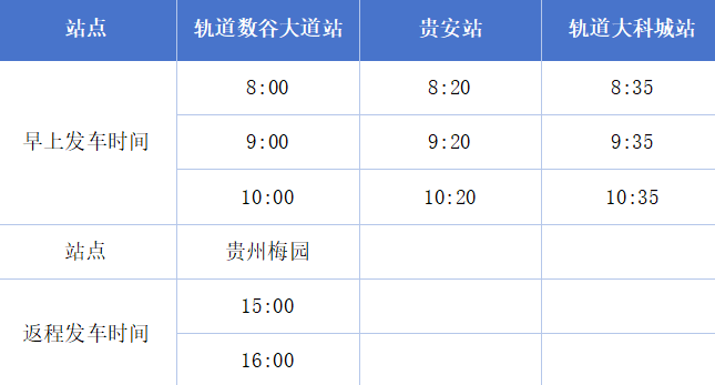 去向:数谷大道公交枢纽(S1号线地铁B1出口)——贵安站(公交站台)——轨道大科城站(A出口)——贵州梅园(往返);