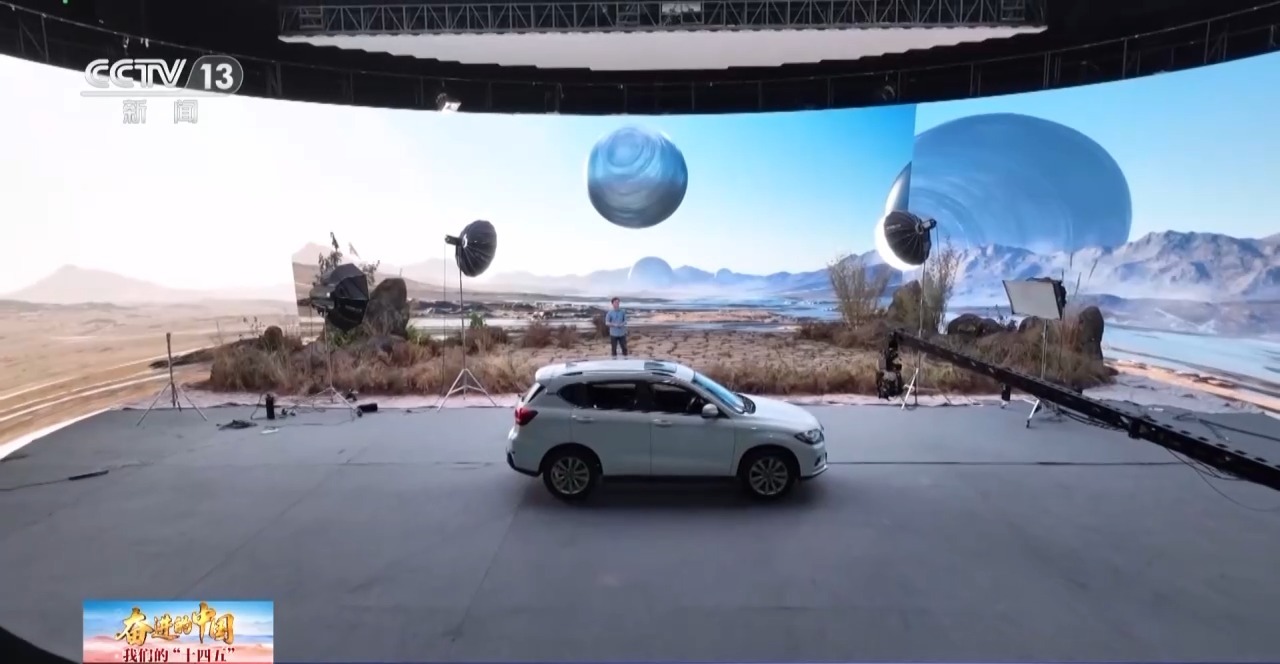 记者站在科技片场的虚拟拍摄棚里,身后的LED背景屏在快速移动变化,实时渲染输出高清画面,从一个场景切换到另一个场景,用时不到1秒钟。