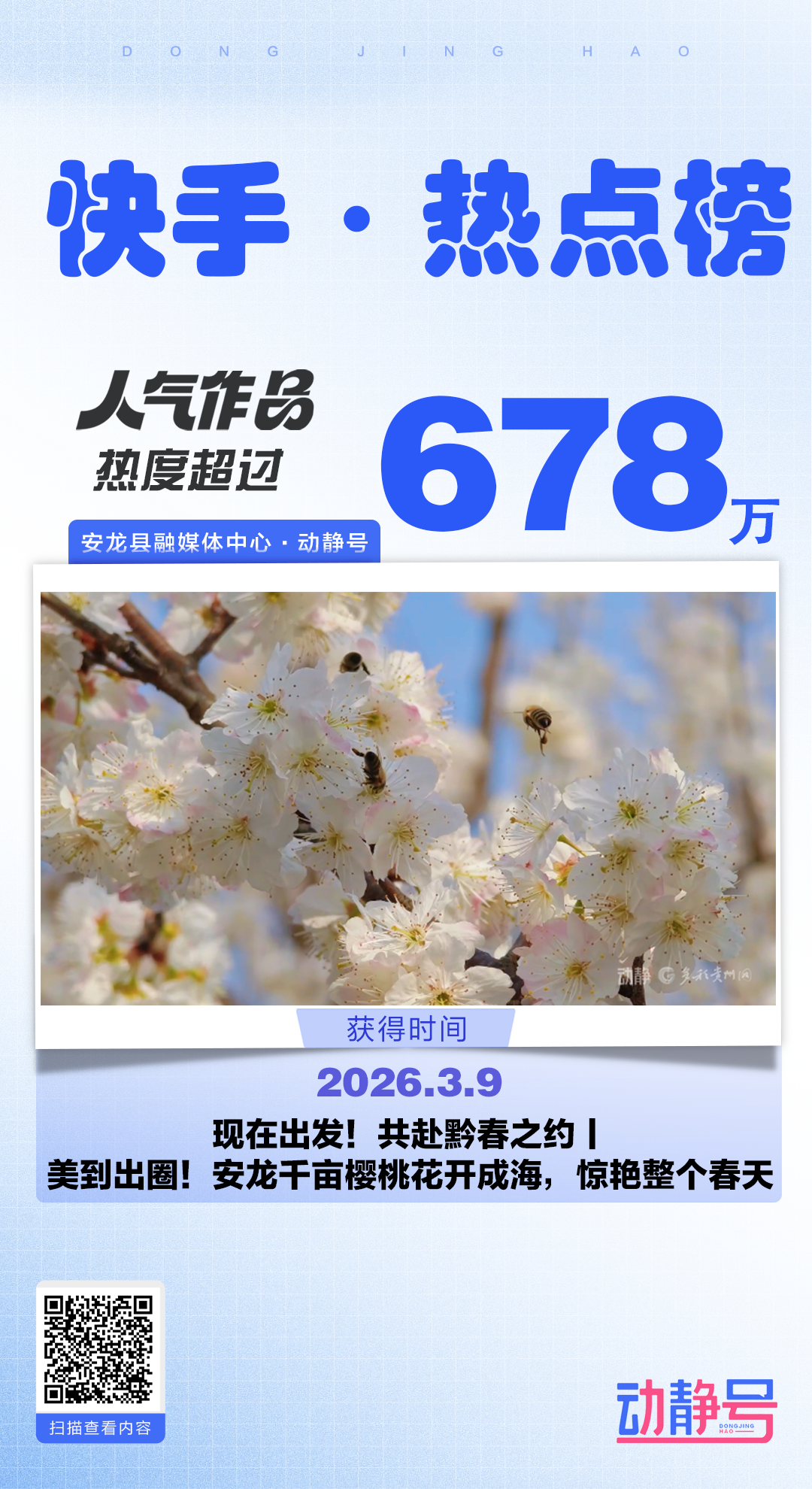 基于安龙融媒视频二次创作的《现在出发!共赴黔春之约丨美到出圈!安龙千亩樱桃花开成海,惊艳整个春天》,不仅获省内多家媒体转载和“学习强国”总平台推荐,更强势登上快手全国热点榜,相关话题热度突破678万,以满屏春色成功“出圈”。