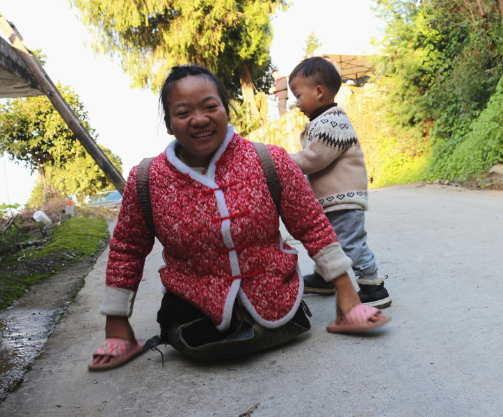 “努力,向幸福前进!”装上白菜,背上背篼,双手撑地,家住遵义市凤冈县凤岭街道青滩村安村组的徐才芬在山路上使劲挪动,缓慢地爬向家。