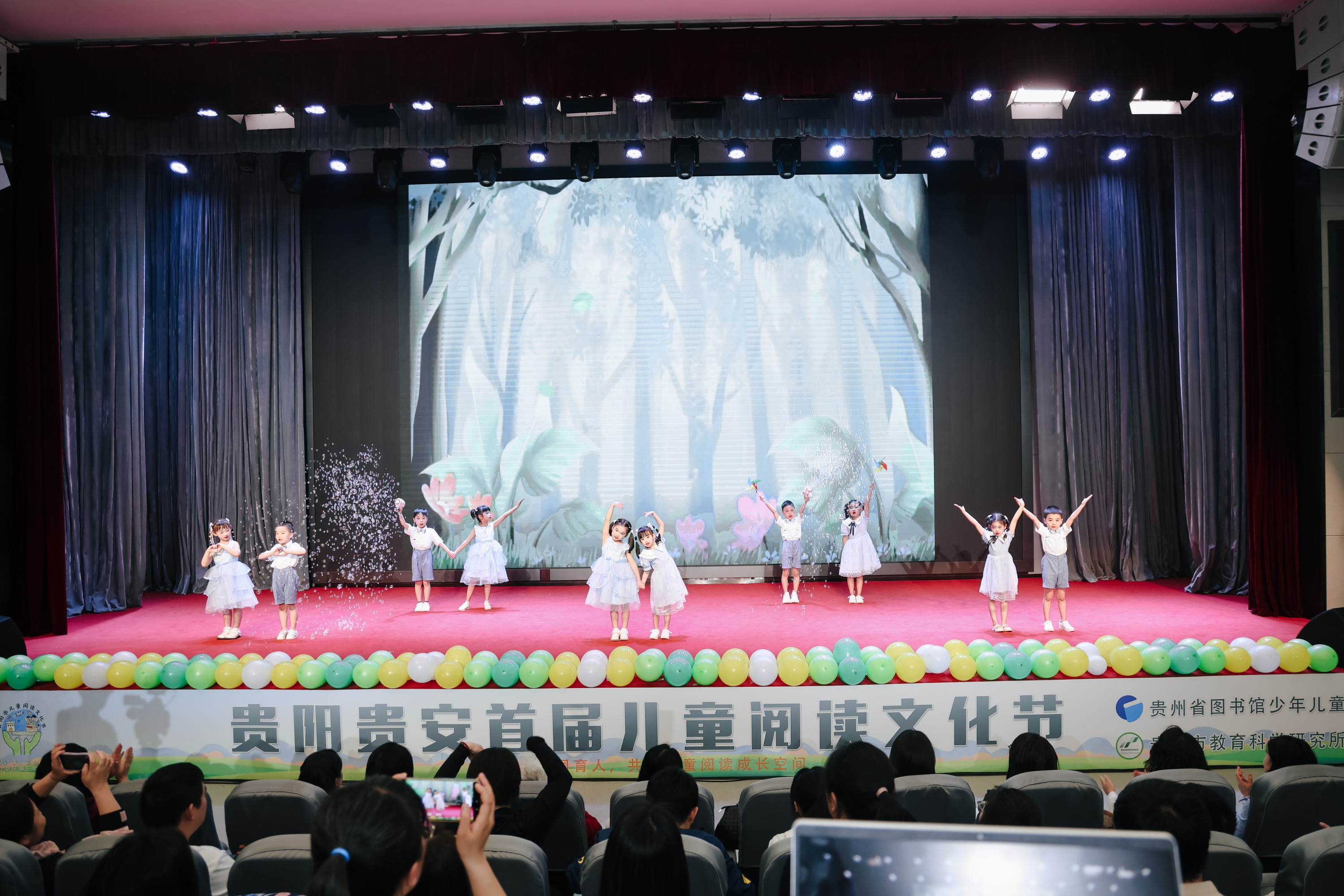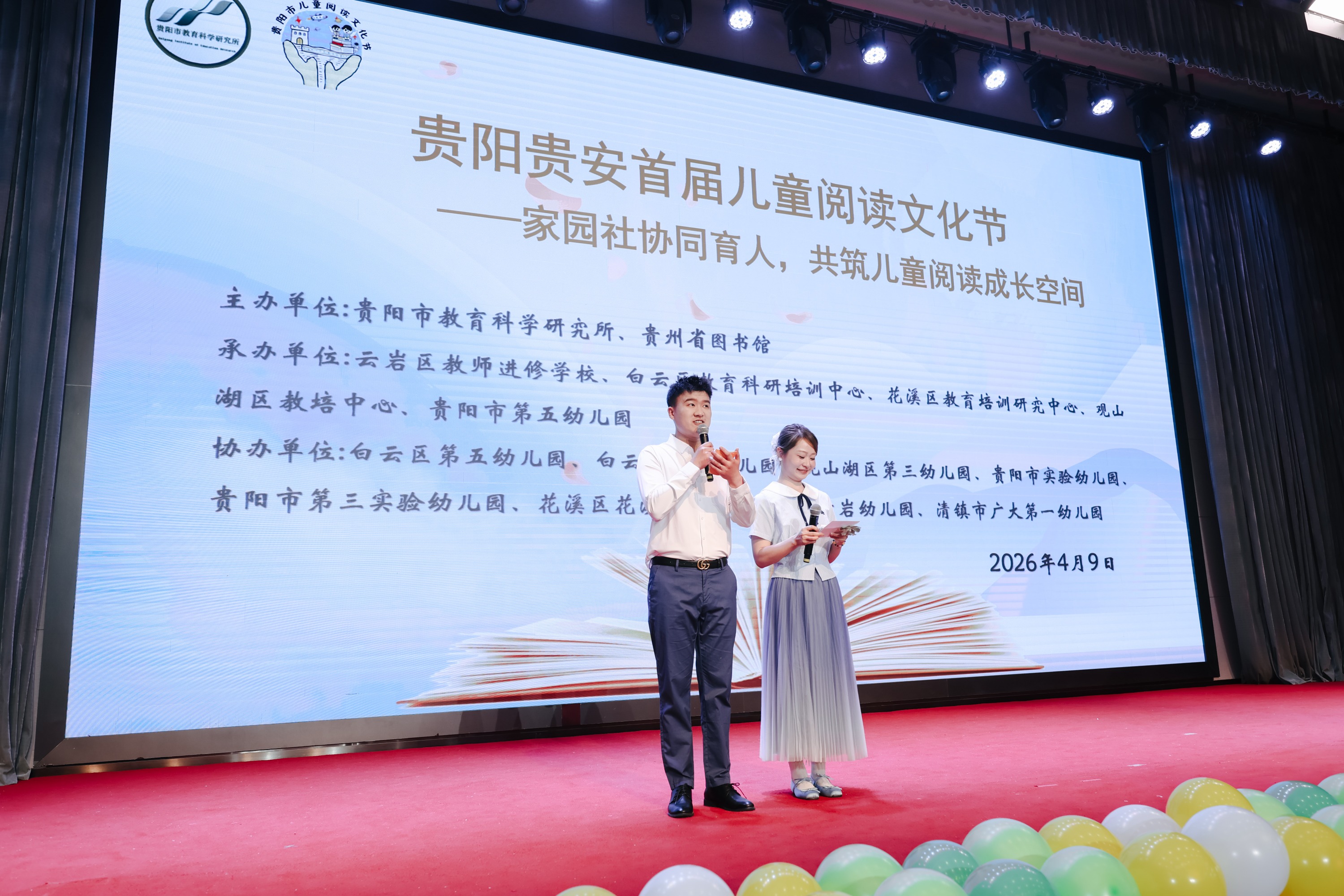 2026年4月9日,2026年4月9日,贵阳贵安首届儿童阅读文化节在贵州省图书馆(北馆)正式启幕。本次活动以“家园社协同育人,共筑儿童阅读成长空间”为主题,由贵阳市教育科学研究所、贵州省图书馆主办,贵阳市第五幼儿园承办,云岩区教师进修学校、白云区第五幼儿园等13家单位联合协办。来自全市绘本共读教育改革项目幼儿园的园长、教师、幼儿及家长代表,连同贵州省图书馆工作人员、社会各界人士近400人齐聚现场,书香四溢,童趣盎然。贵阳幼儿师范高等专科学校(原副校长)杨汉潜、贵州省图书馆党委委员、副馆长付光磊、贵州省教育科学院小学语文教研员袁克丽、贵州省图书馆少儿部主任周琦,以及贵阳市教育科学研究所学前研究室主任王艳、学前教研员王芳芳,还有来自云岩区、白云区、观山湖区、花溪区、清镇市的学前教研员亲临现场参加活动。