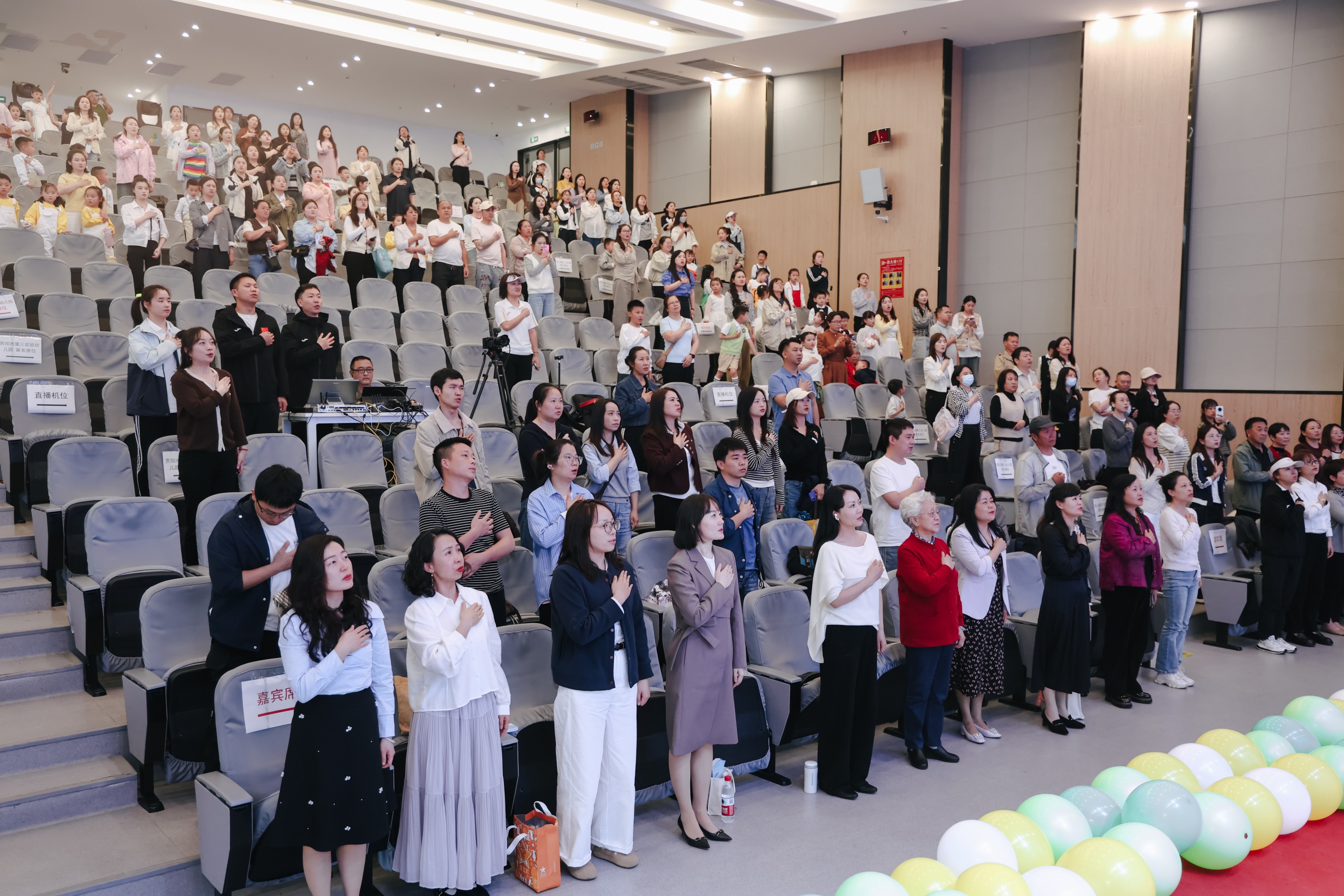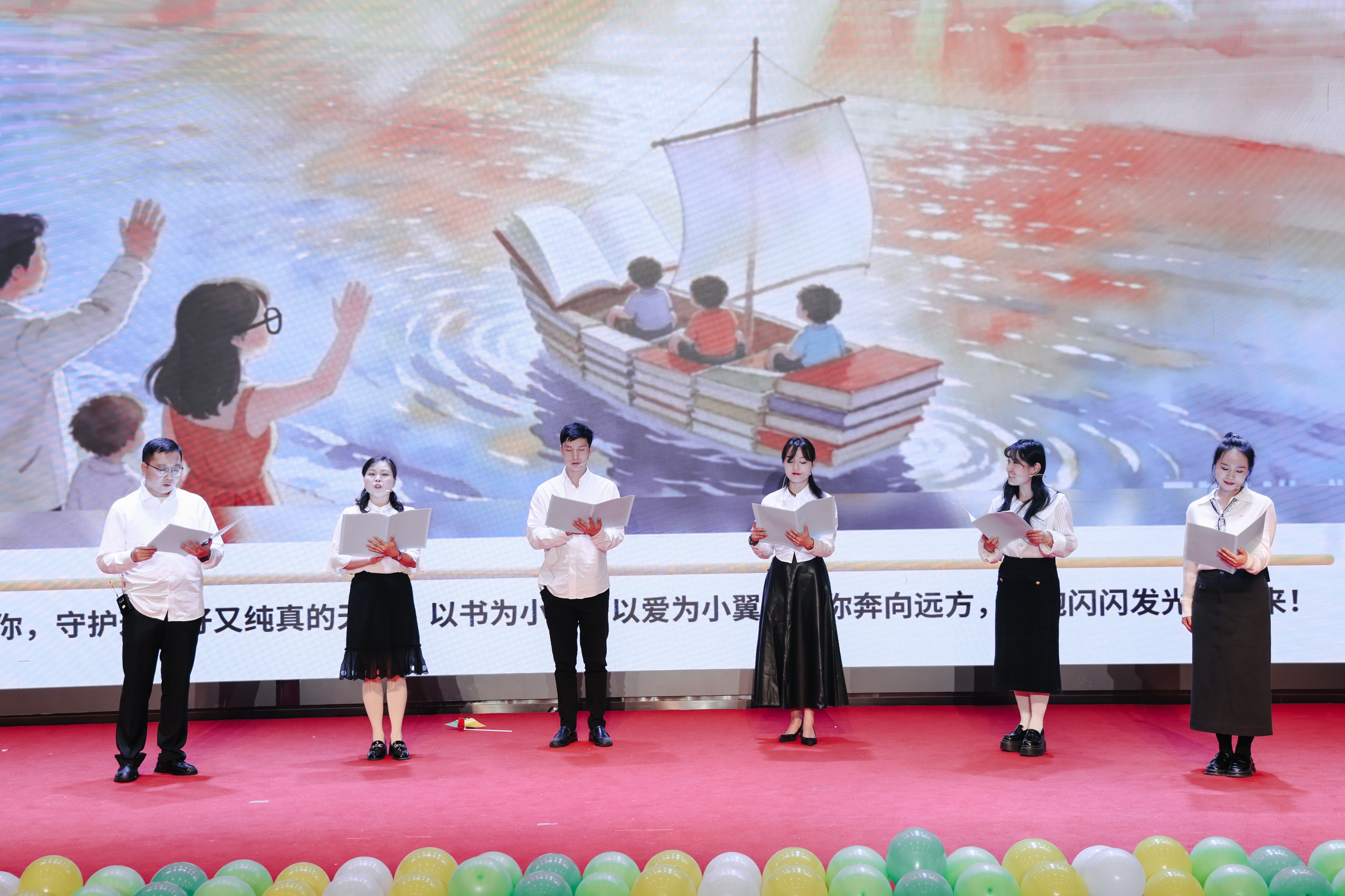 展演尾声,贵阳市实验幼儿园园长龚燕创作的诗歌《阅读,就是我和你》由教师与家长代表深情朗诵。随后,全场起立,举起右手,共同宣誓:“用爱陪伴童年,用智慧引领阅读;让书香成为童年最温暖的底色;让阅读成为一生最珍贵的习惯;以书为船,以爱为帆;守护童年,点亮未来!”这一庄严而温暖的仪式,将活动推向情感与价值的高潮。
