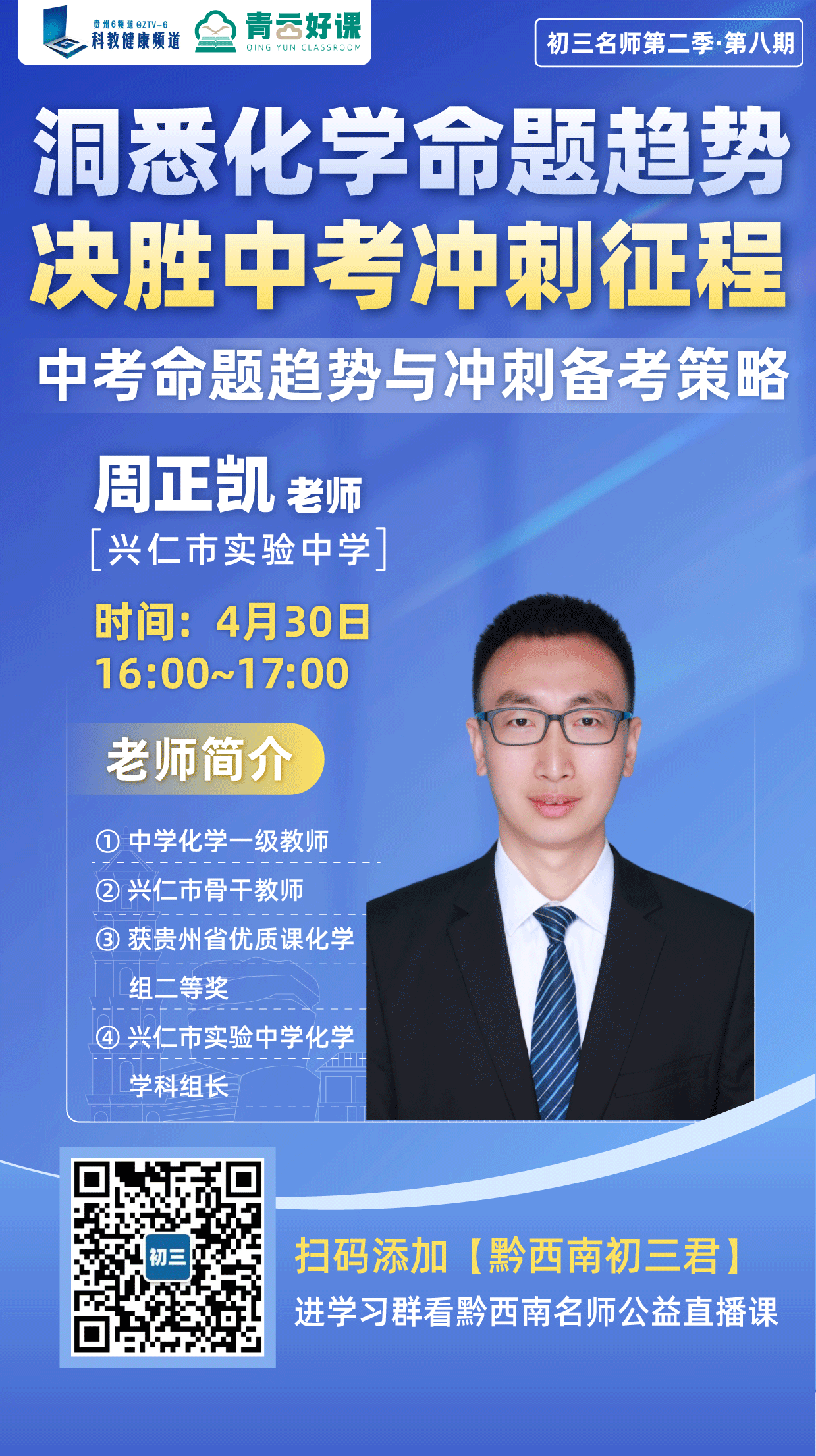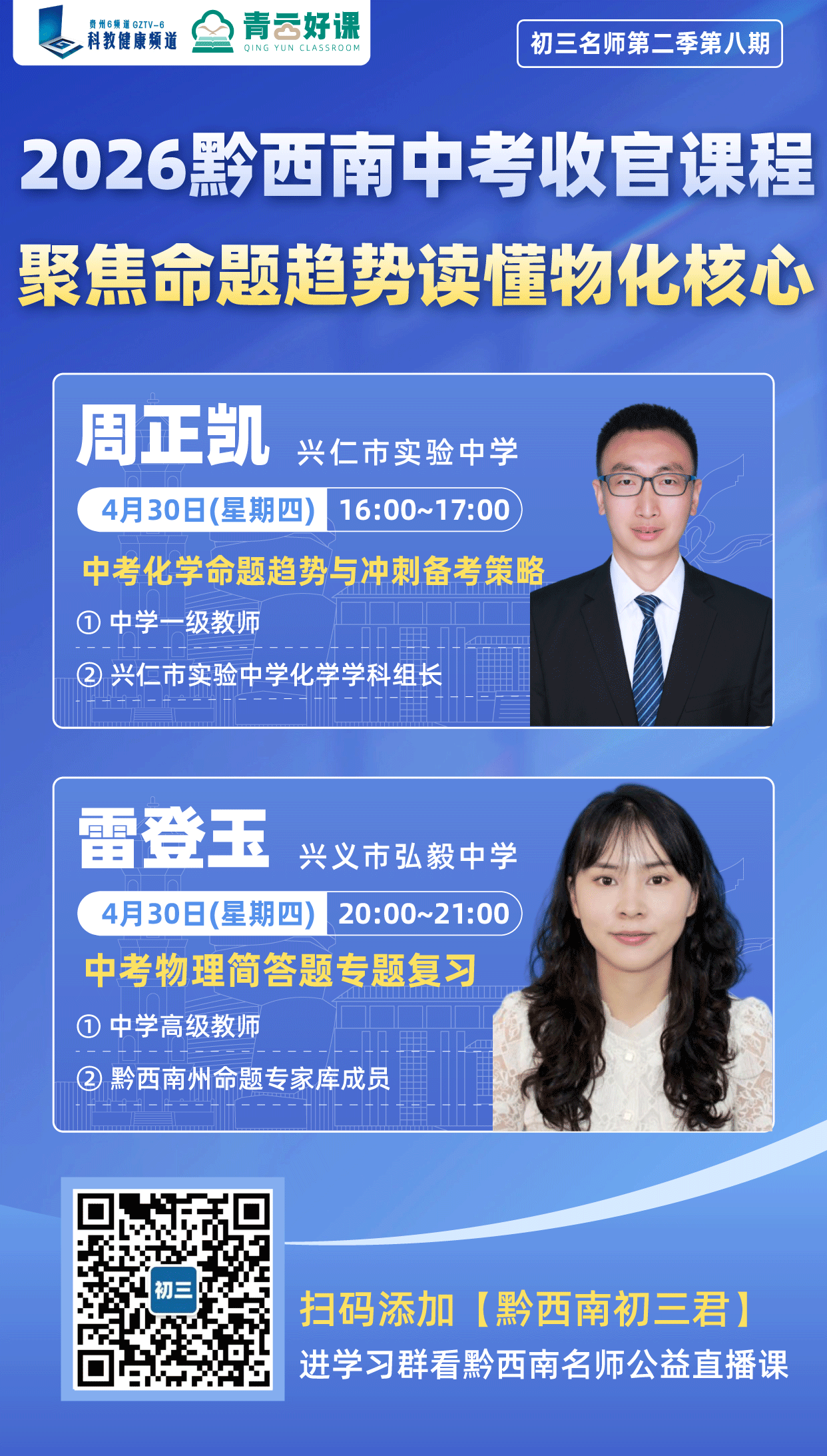 本周“青云好课”为中考理科命题趋势和专项题目解析专场,我们邀请到兴仁市实验中学化学学科组组长周正凯老师和兴义市弘毅中学州级命题库专家雷登玉老师,带领大家读懂2026中考命题!