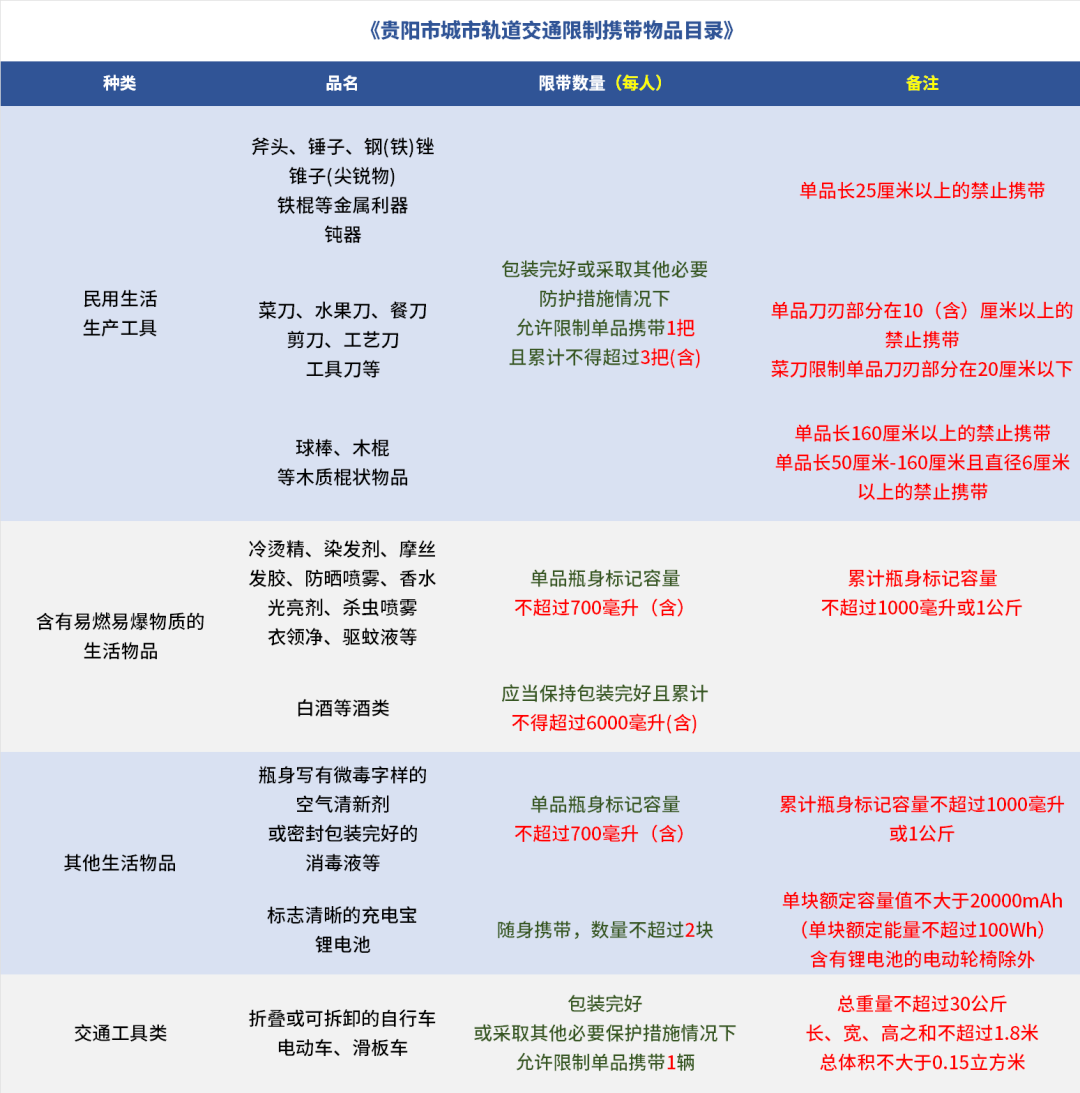下方为《贵阳市城市轨道交通限制携带物品目录》的明细: