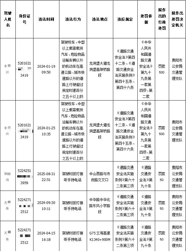 以下人员因实施道路交通安全违法行为,交通违法事实清楚、证据确实充分,根据《中华人民共和国道路交通安全法》等有关法律规定,应当依法予以处罚。贵阳市公安局交通管理支队经多种方式无法联系到本人。现因涉嫌的交通违法逾期未处理,根据《中华人民共和国行政处罚法》第四十四条和《公安机关办理行政案件程序规定》第一百六十七条、一百六十八条之规定,将拟作出的行政处罚内容及事实、理由、依据以及违法行为人依法享有的陈述、申辩、要求听证等权利公告如下:
