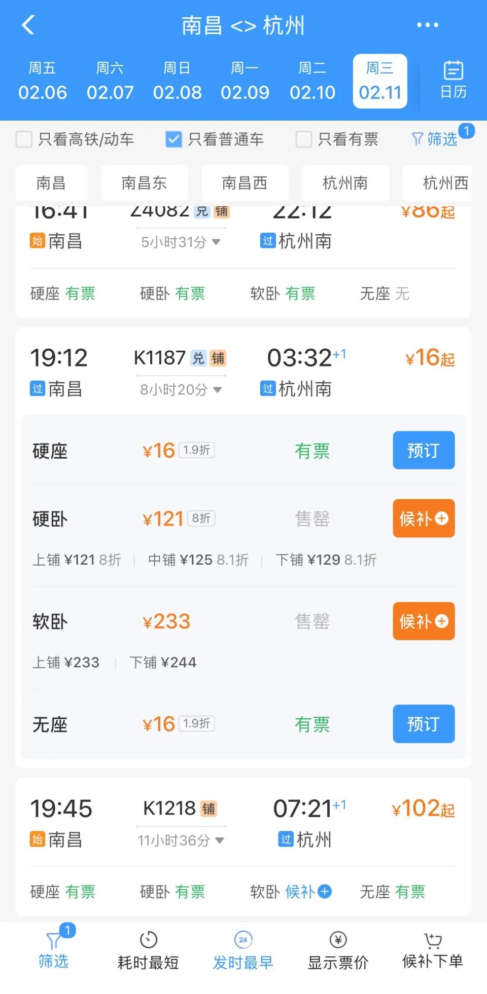 2月9日至11日,南昌至杭州南的K1187次列车,每日一班,硬座优惠价16元;