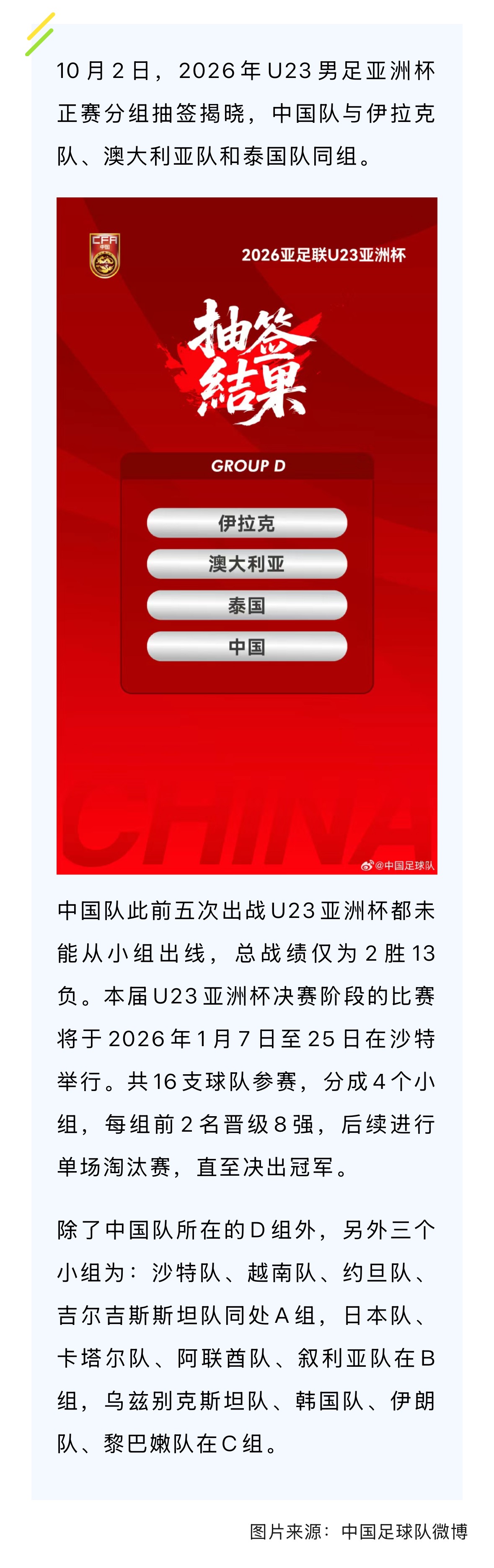 2026年U23男足亚洲杯分组出炉